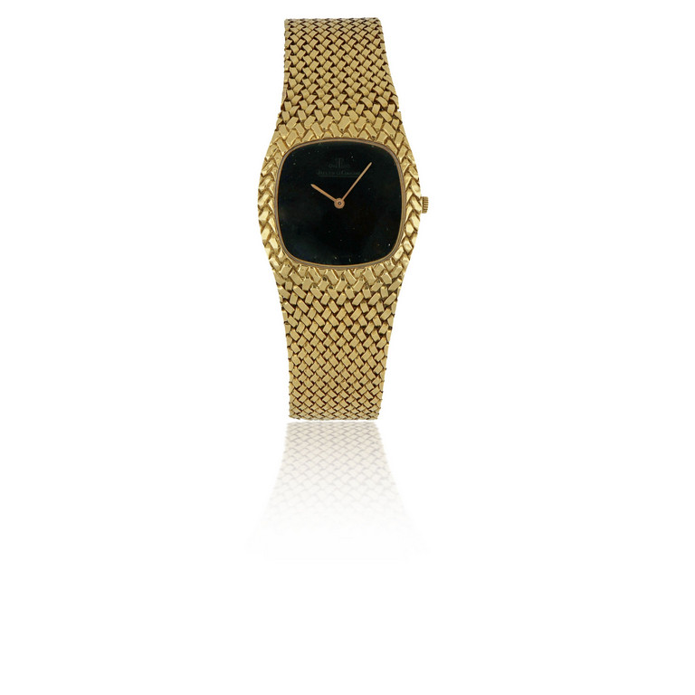Jaeger LeCoultre orologio meccanico a carica manuale lady cassa e bracciale uniti motivo a corteccia interamente in oro quadrante nero privo di indici solo tempo sfere a bastone.