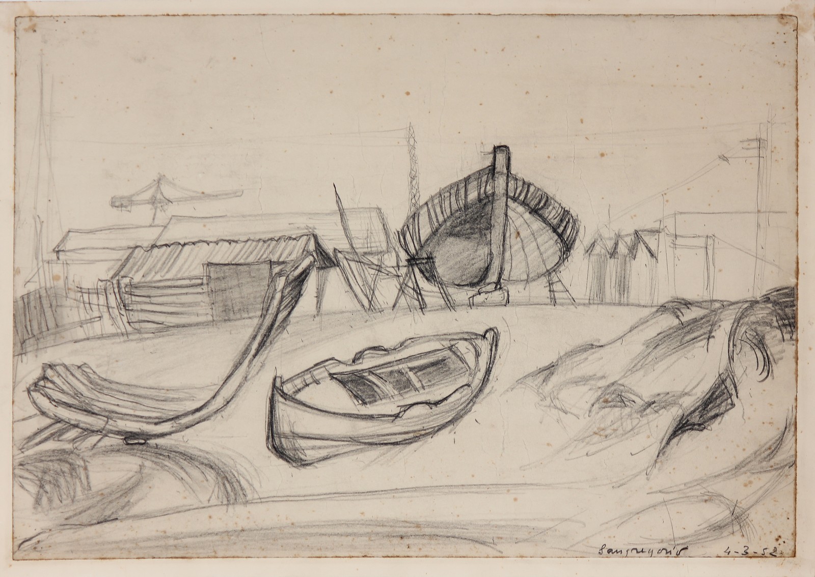 SANGREGORIO GIANCARLO (n. 1925) Marina con barche. 1952. Matita su carta. Cm 53,00 x 38,00. Firmato e datato in basso a destra 4-3-52.