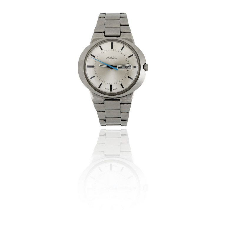 OMEGA Orologio vintage anni 70 in acciaio meccanico a carica automatica modello Dynamic day date cassa ad elisse vetro plastica quadrante argentè con lancetta dei secondi azzurra indici a bastoni neri giorno italiano e numero data ad ore 3. Bracciale in acciaio con chiusura a deployante.