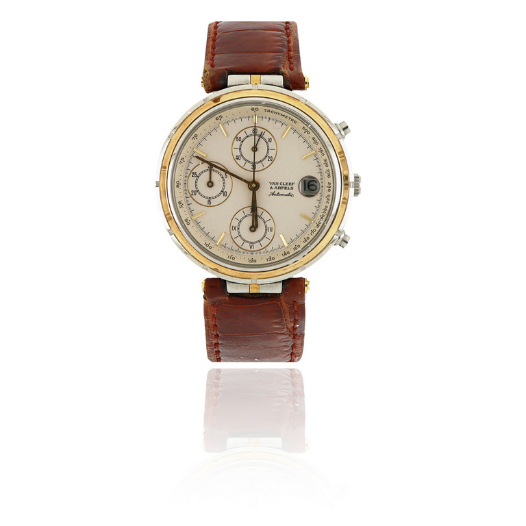 VAN CLEEF & ARPELS cronografo da polso automatico cassa in acciaio e lunetta oro. Indici a bastoni data a ore tre sfere a bastoni tasti a pompa scala tachimetrica minuteria aperta.