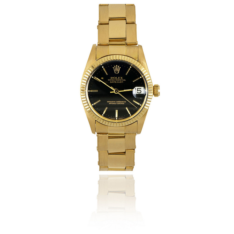 Rolex orologio unisex in oro giallo con bracciale Oyster ref. 6824 modello DateJust medio raro esemplare con quadrante nero e grafica oro indici a barretta e sfere a bastone luminescenti animato da movimento meccanico a carica automatica con scatto lento del datario in perfette condizioni di conservazione.