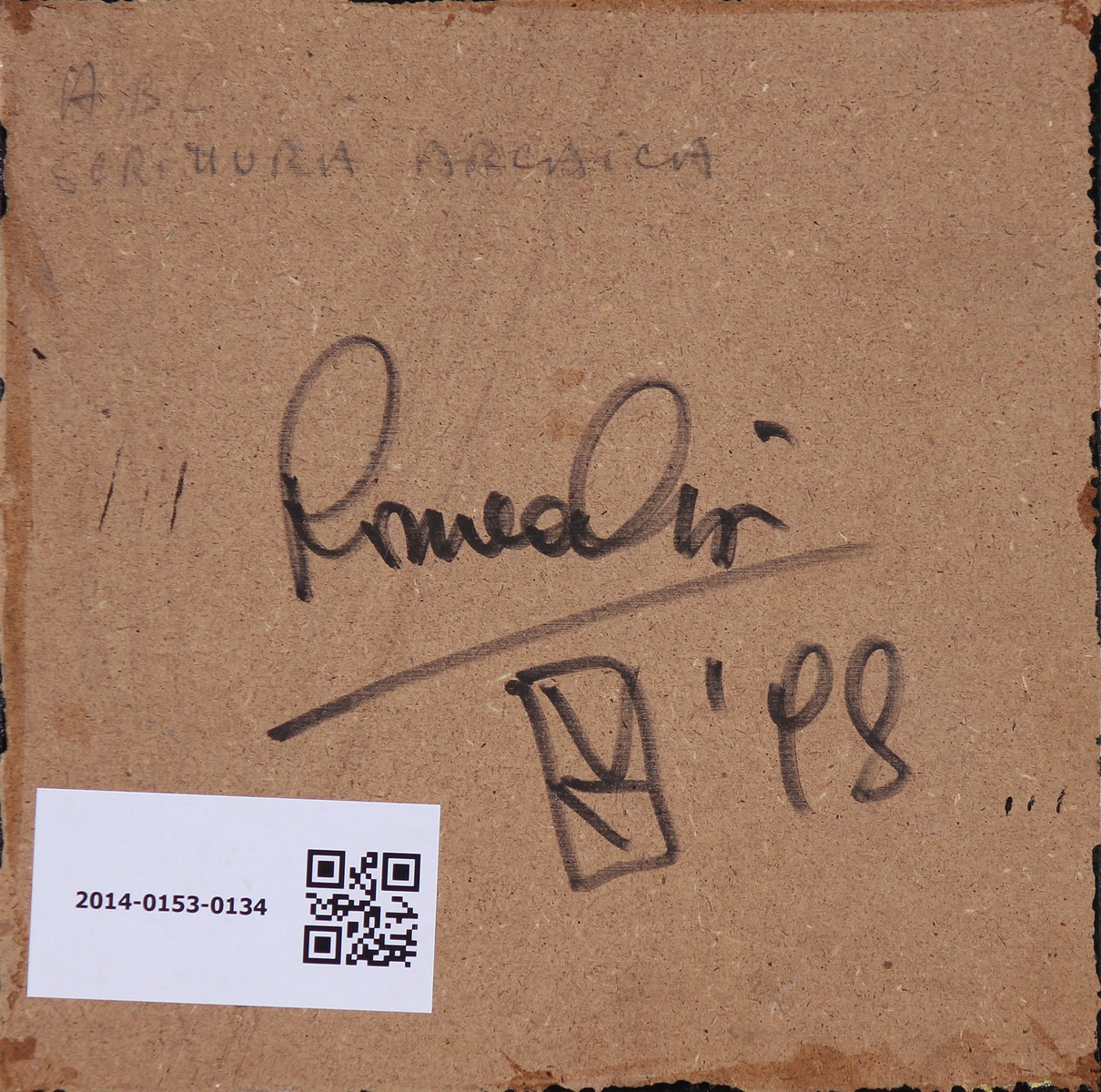 ORSI ROMEO (n. 1946) Scrittura arcaica. 1998. tecnica mista su carta su tavola. Cm 19,00 x 19,00. Firma titolo e anno al retro.
