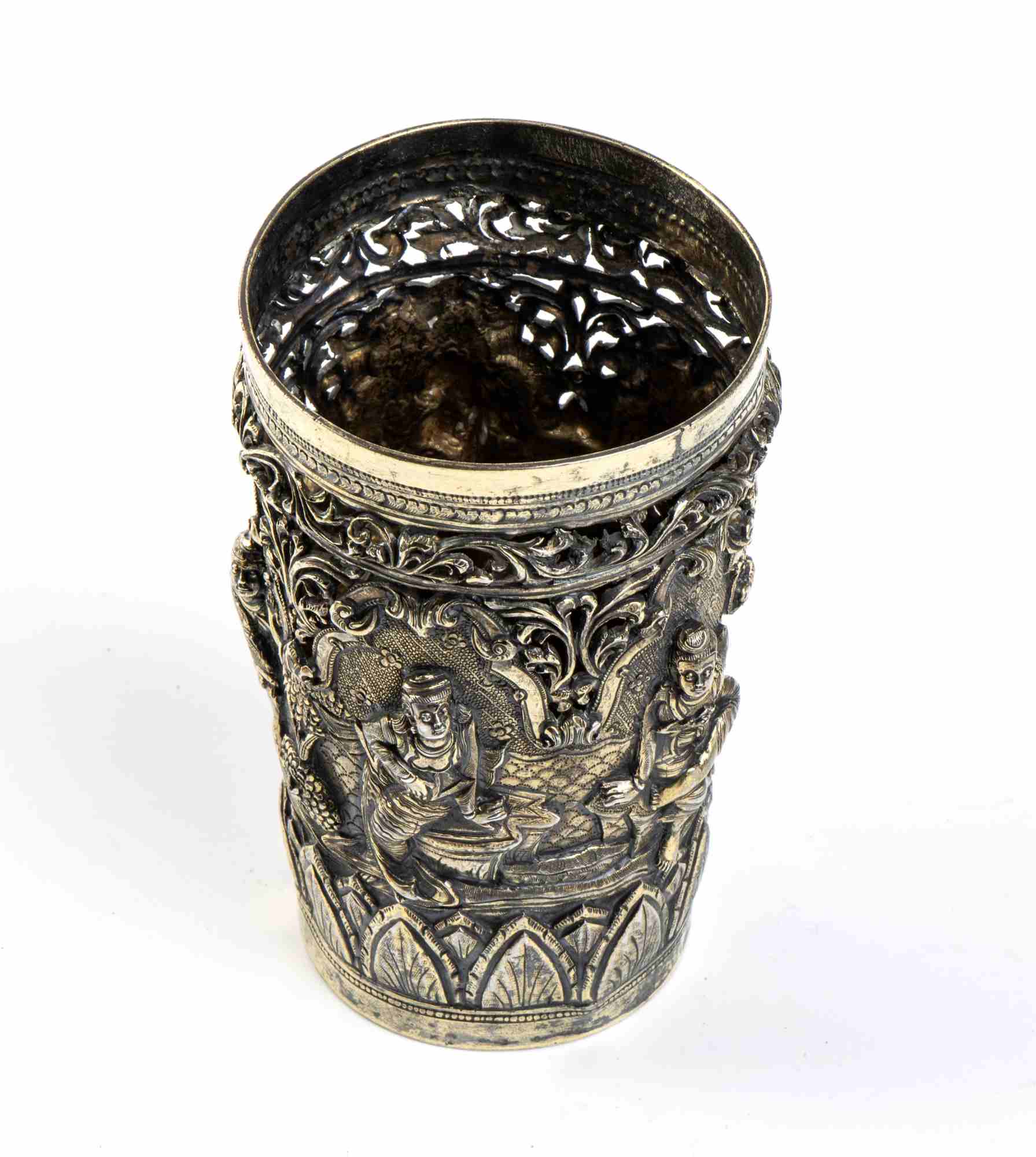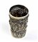 L'esterno con una fine decorazione in accentuato rilievo con figure e arabeschi vegetali, la fascia superiore nei pressi della bocca lavorata 'a giorno'.