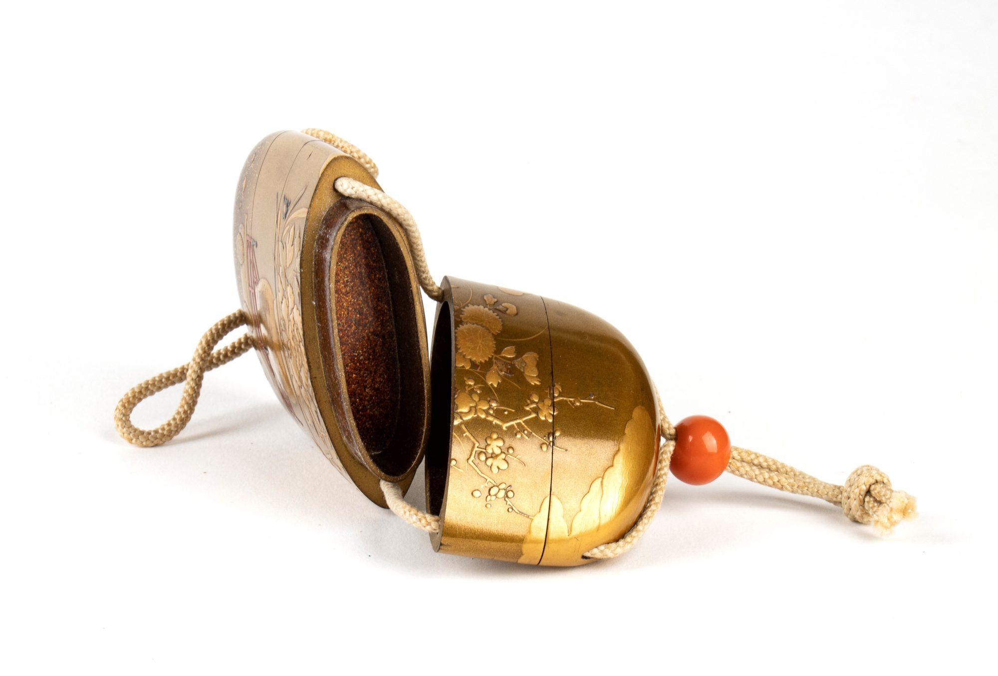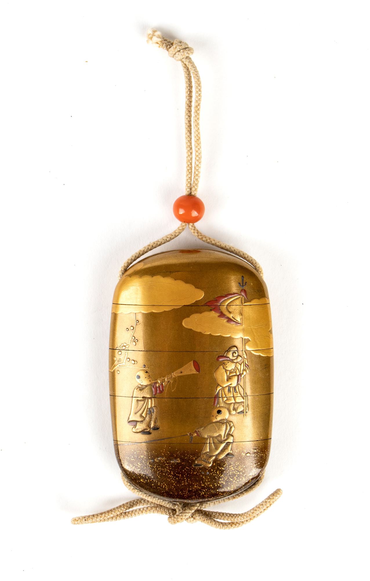 Lavorato con le tecniche del maki-e ("pittura a oro cosparso"), su un lato vaso con fiori, sull'altro tre bambini nel paesaggio, firmato 梶川作 (Kajikawa saku) con vaso.