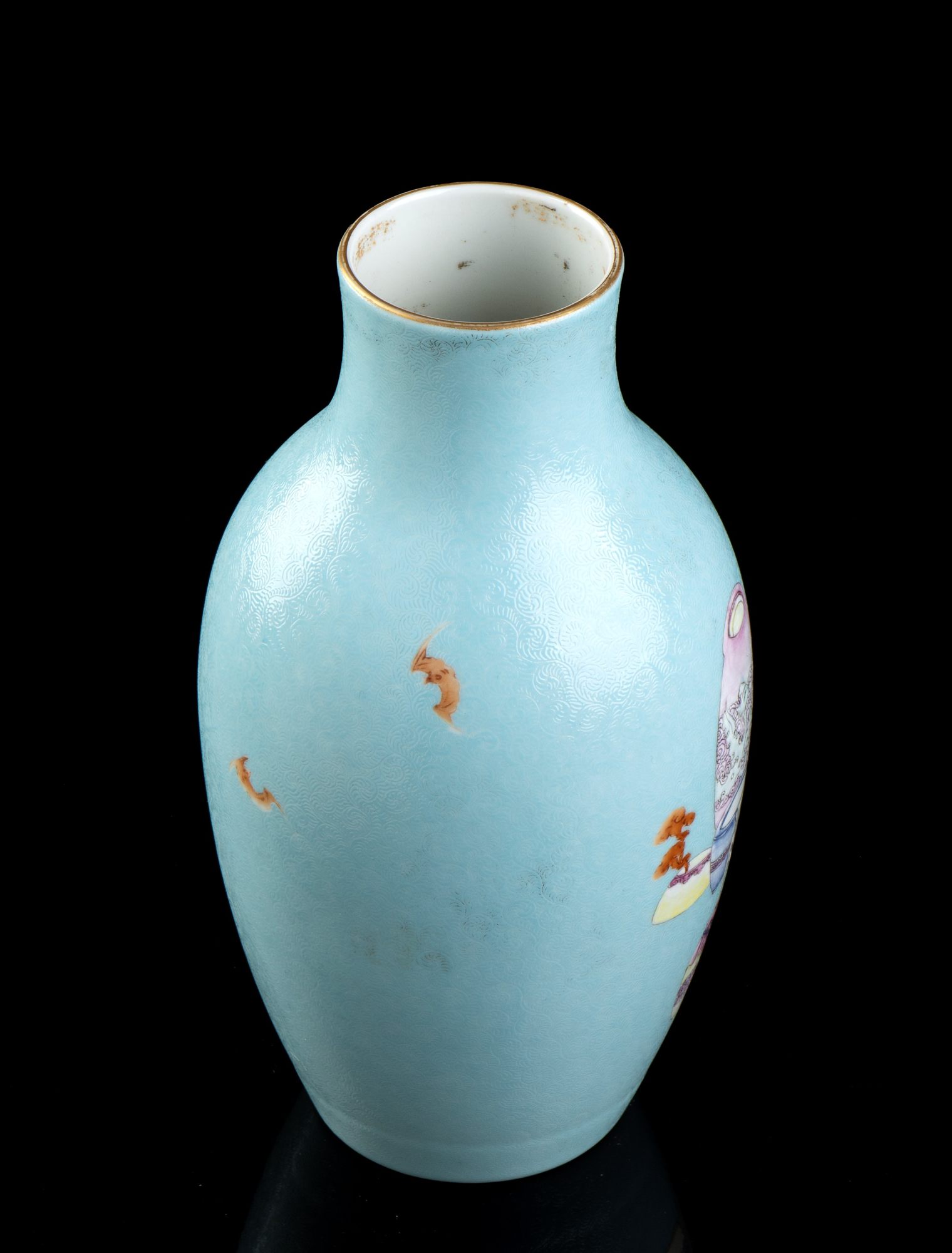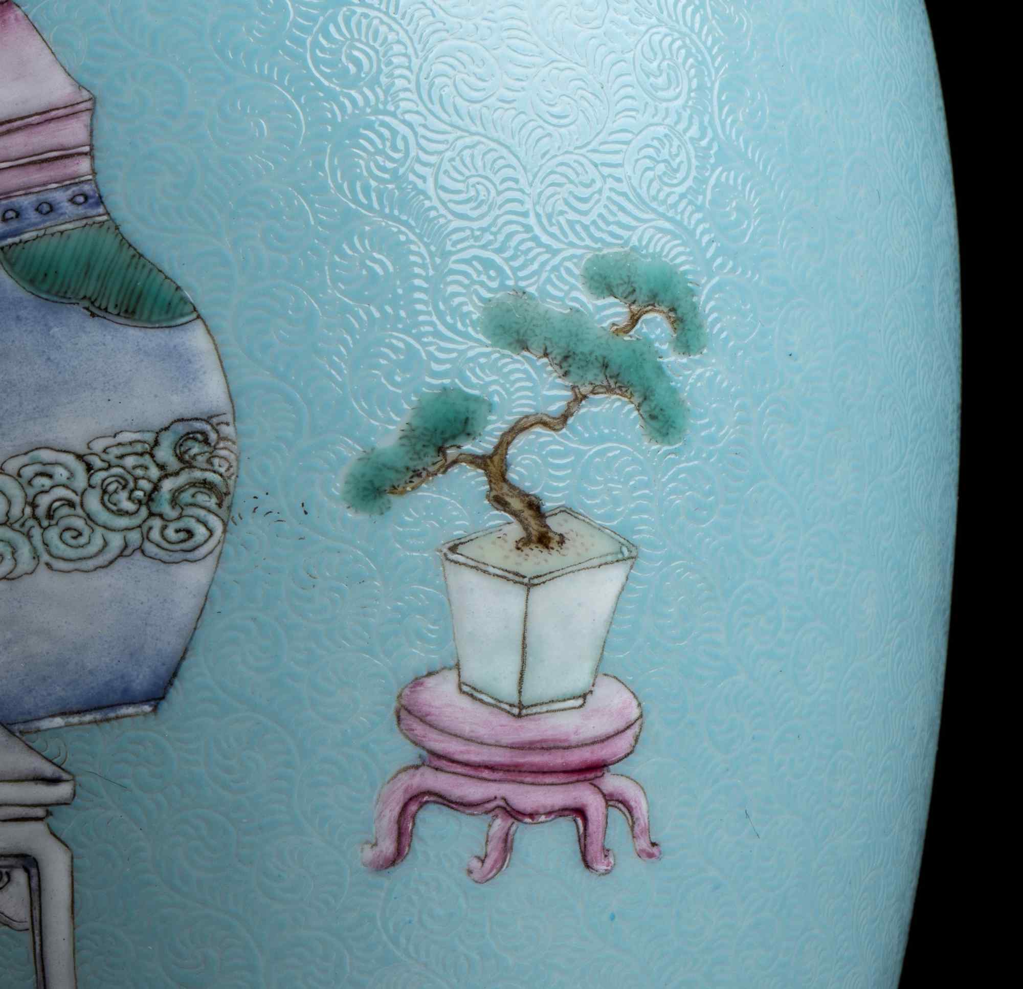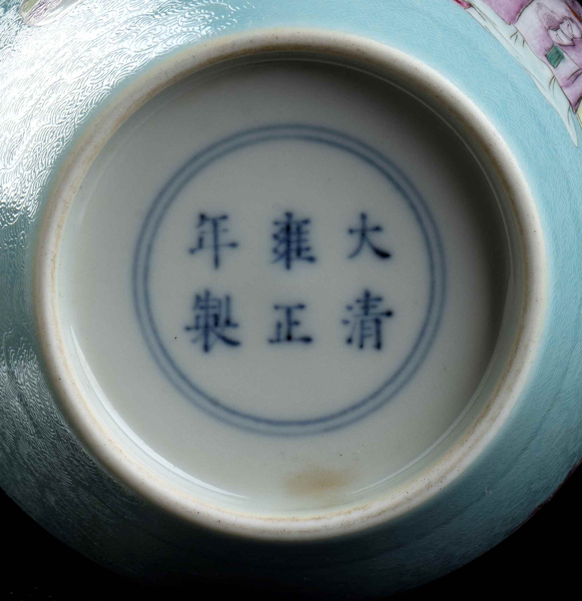 Decoro con figure su fondo turchese inciso con arabeschi, marchio apocrifo di Yongzheng al centro della base.