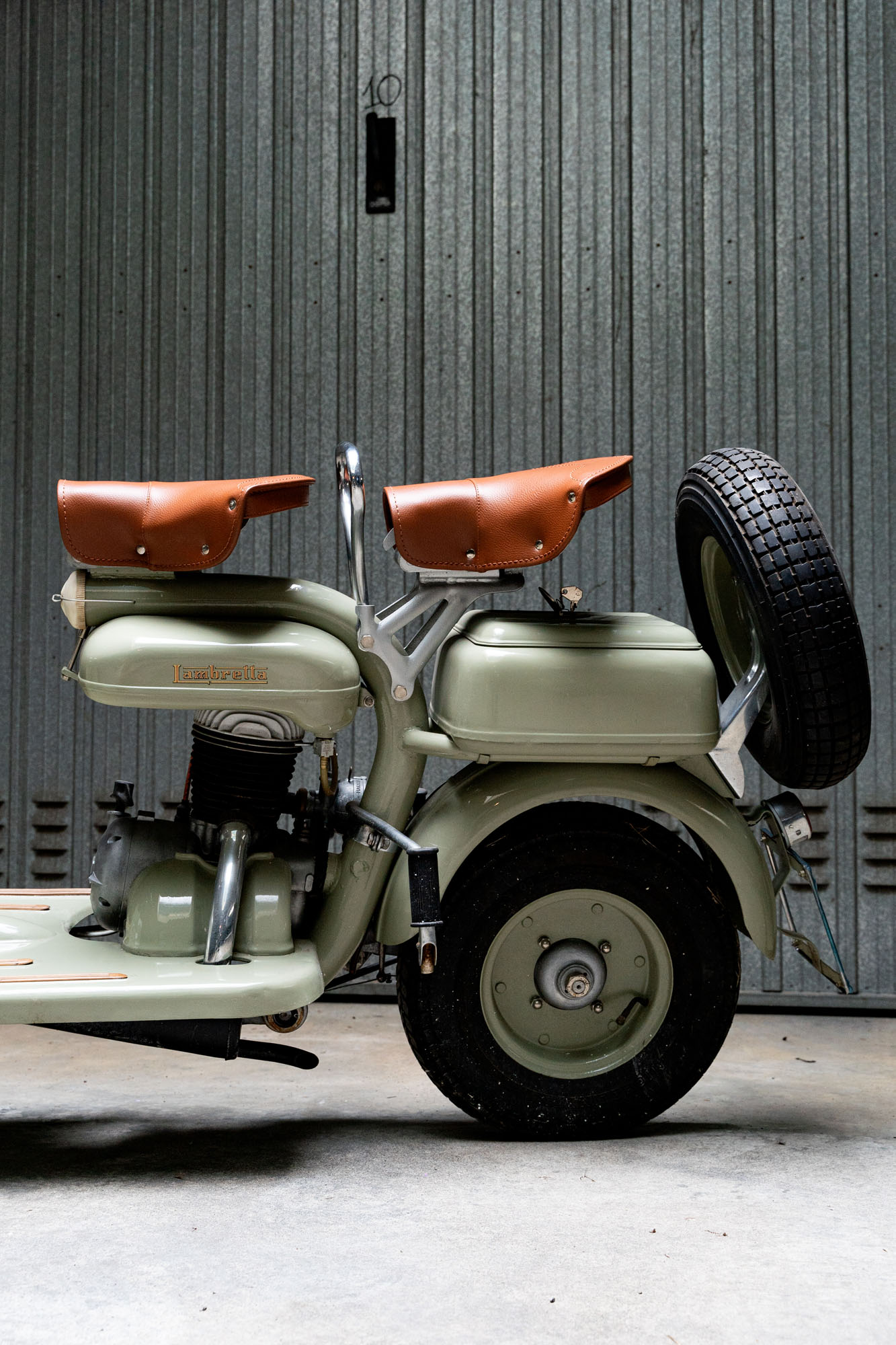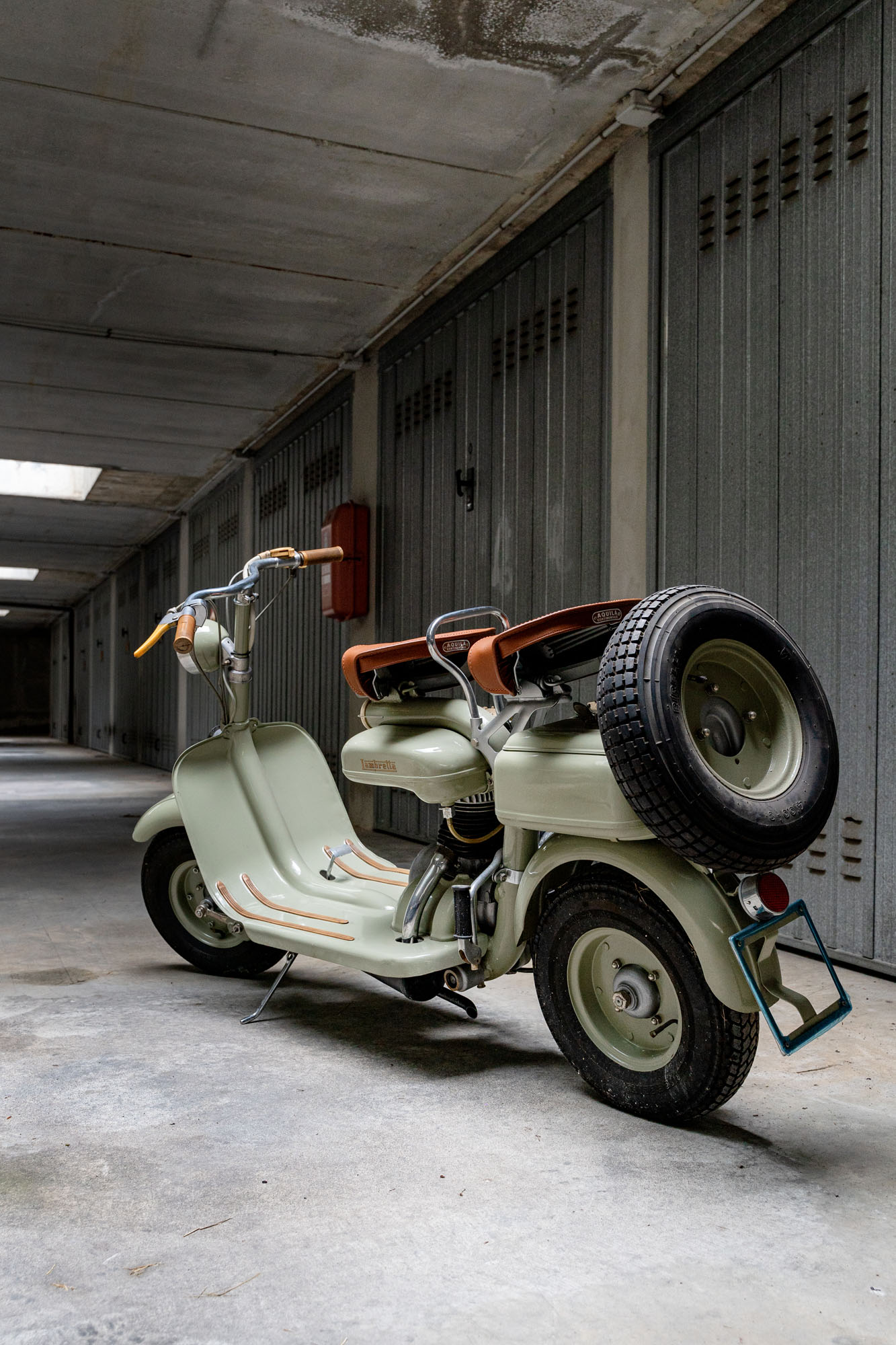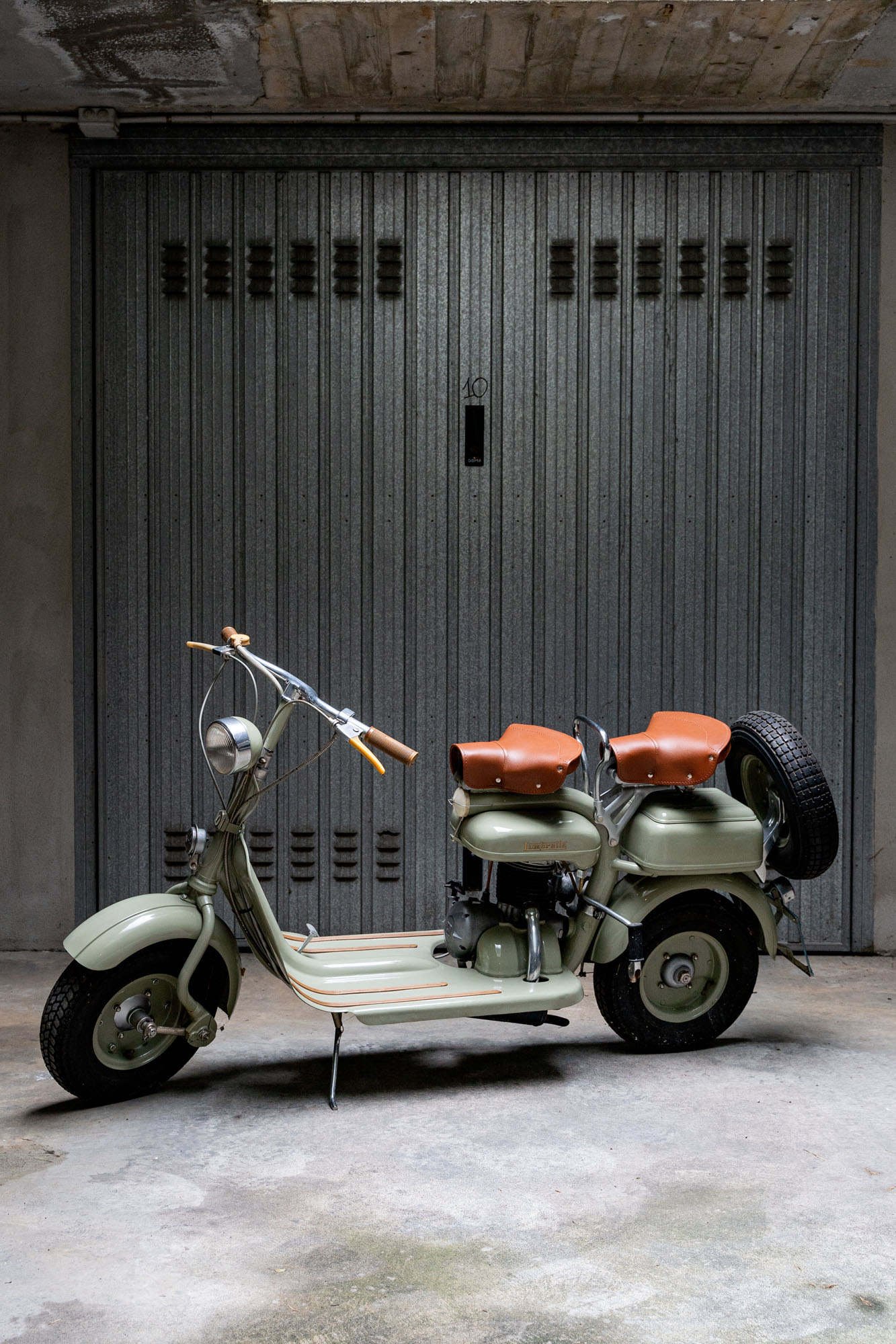 LAMBRETTA125 E1953Telaio num. 15427- Con accensione a strappo e cavalletto laterale- Restauro totale- Ottime condizioni generali- Con pneumatico di scorta originale Pirelli- Nel suo verde oliva 8021