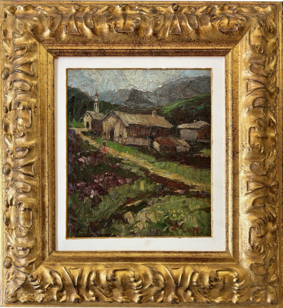 Alessandro Lupo, Torino 1876 - 1953, Paesaggio montano con chiesetta, olio su tavoletta cm 22,5x20 firmato in basso a dx