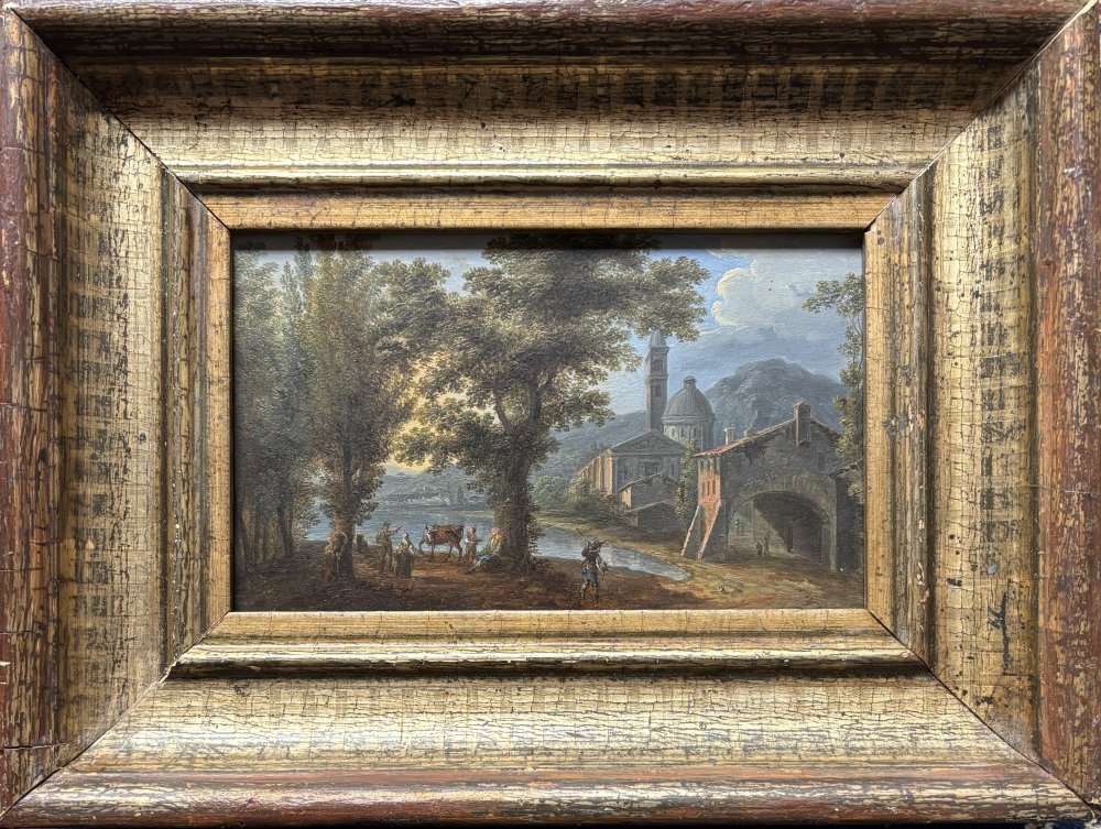 Giovanni Migliara, Alessandria 1785 - 1837 Milano, Paesaggio lacustre con figure, Olio su tavola cm 12x19,5 firmato in basso a dx