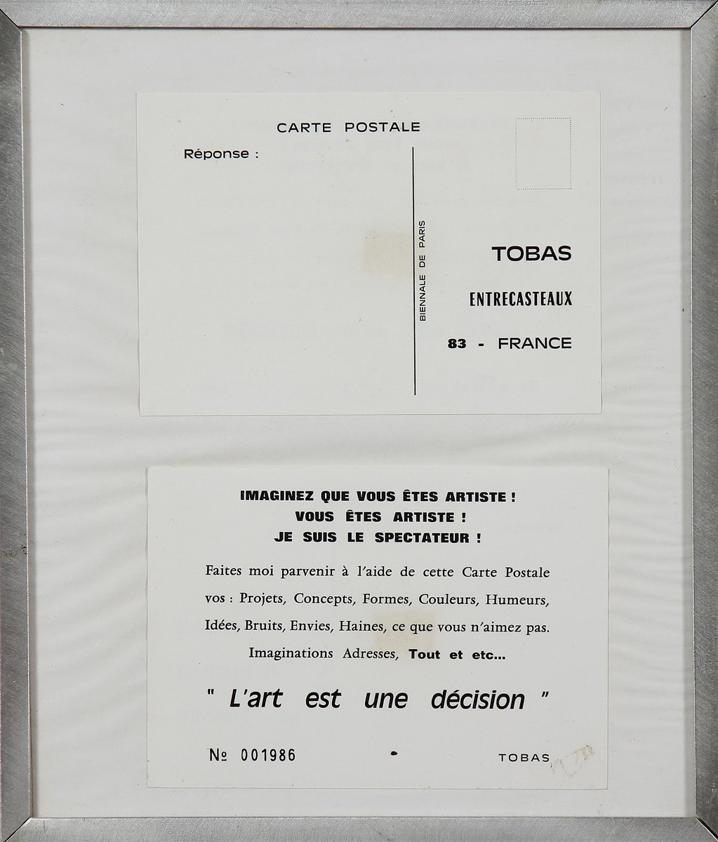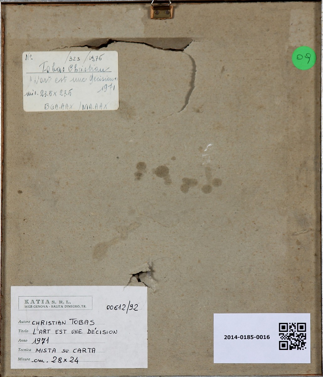 TOBAS CHRISTIAN (n. 1944) L'art est une decision. 1971. Collage su carta. Cm 24,00 x 28,00 x 3,00. Al retro cartiglio descrittivo a cura di Katia srl, Genova. Cornice presente