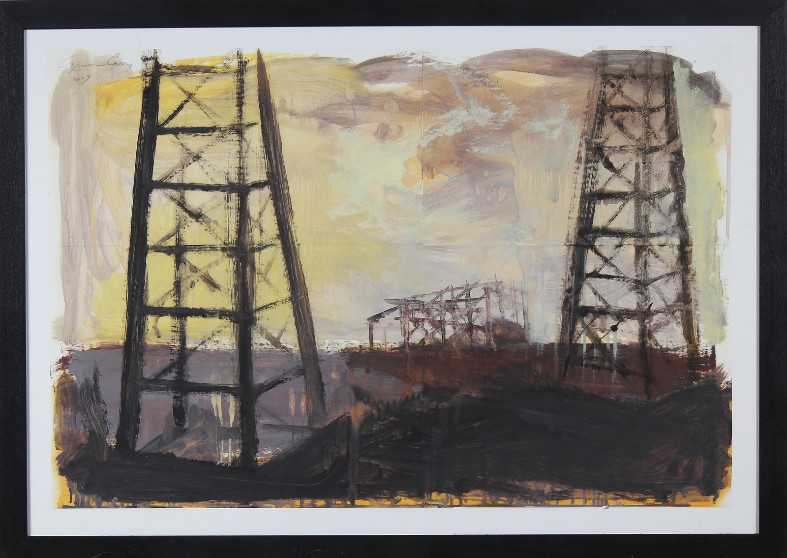 CERRI GIOVANNI (n. 1969) Paesaggio. 2009. Olio su carta. Cm 80,00 x 60,00. Firma e anno in alto al centro. Al retro dedica. Cornice presente