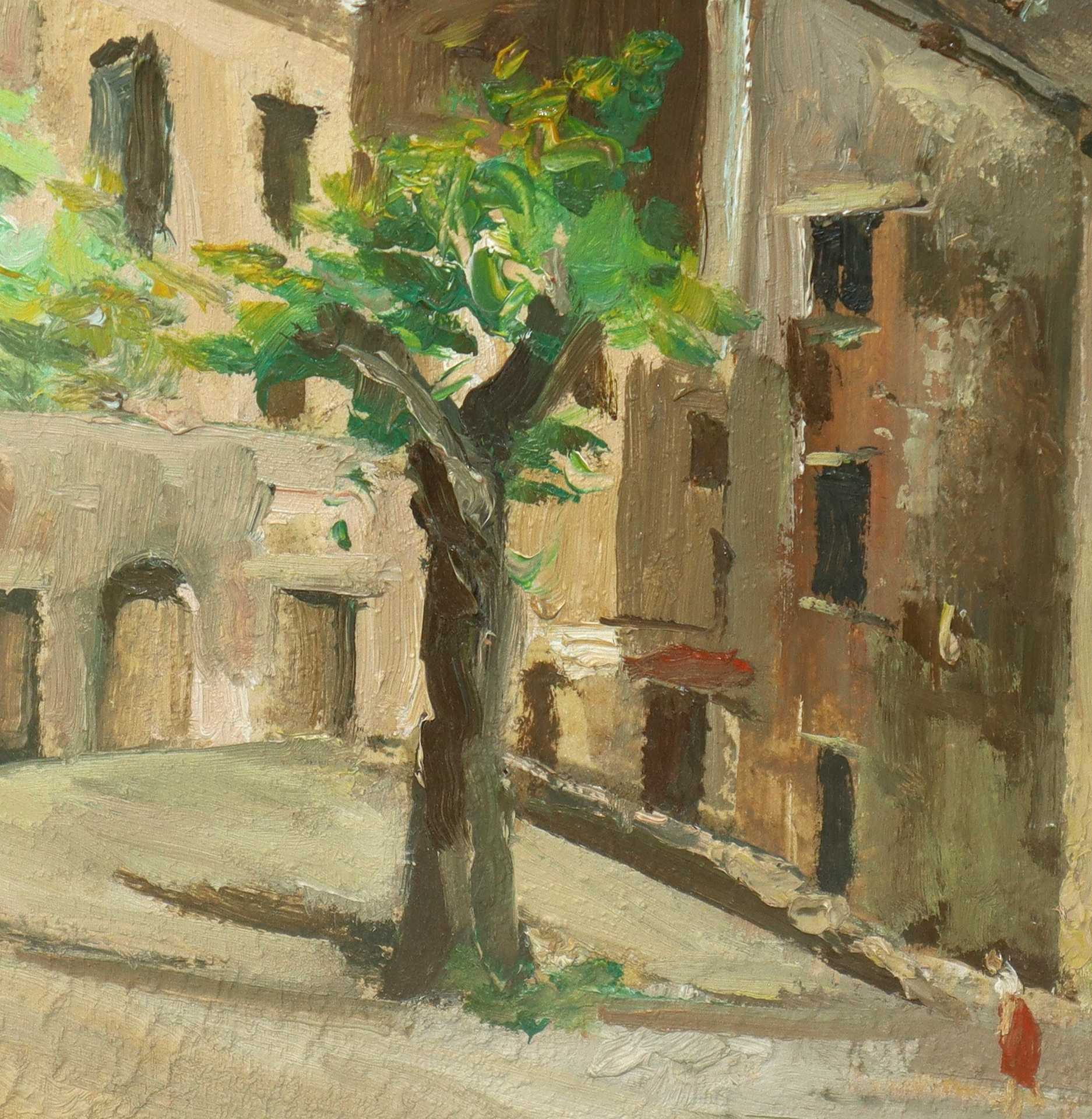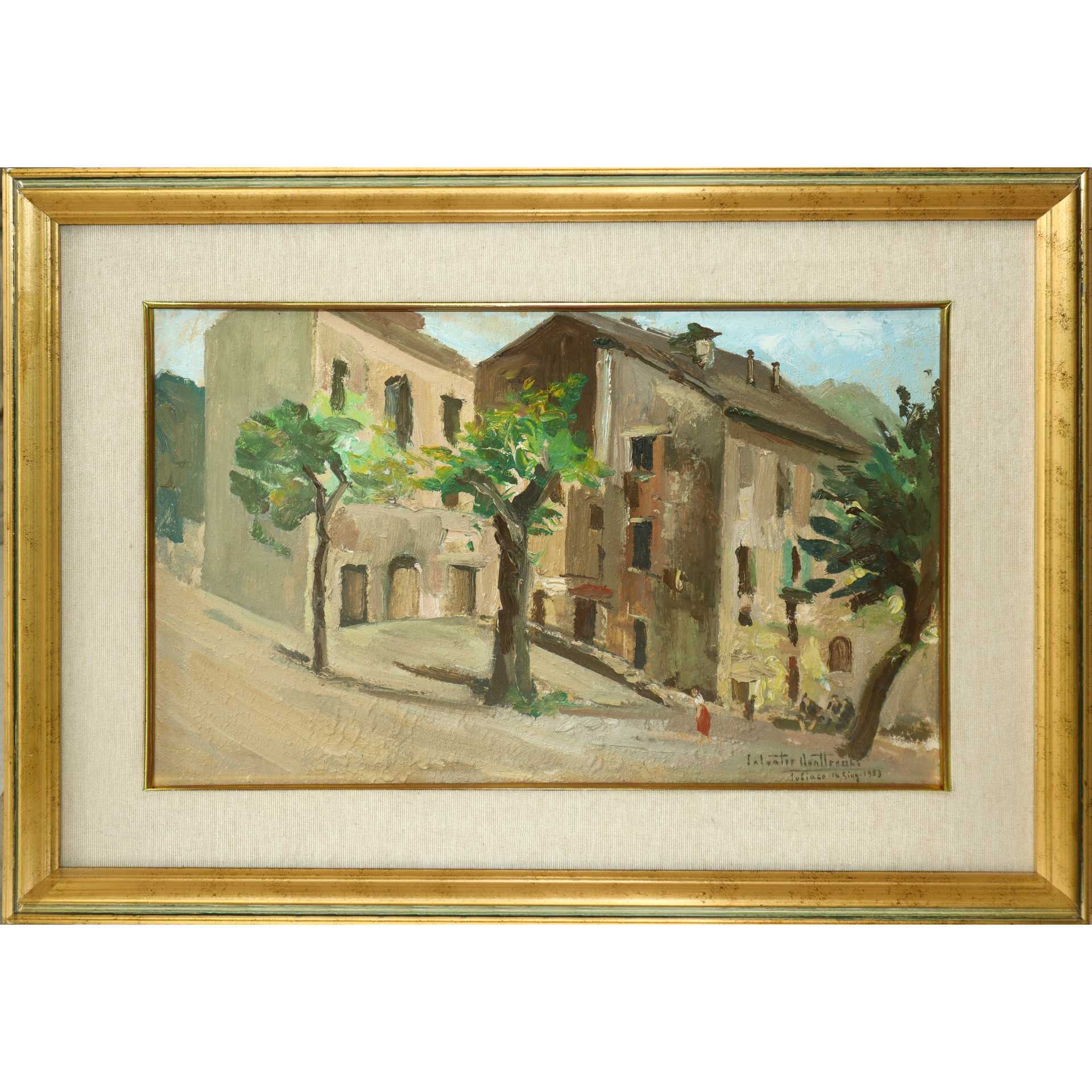 Salvatore Quattrocchi - Scorcio di case con alberi, 1983 cm 27,5x42 in cornice cm 40,5x55,5 Olio su tavola Firmato in basso a destra e datato Subiaco 1983