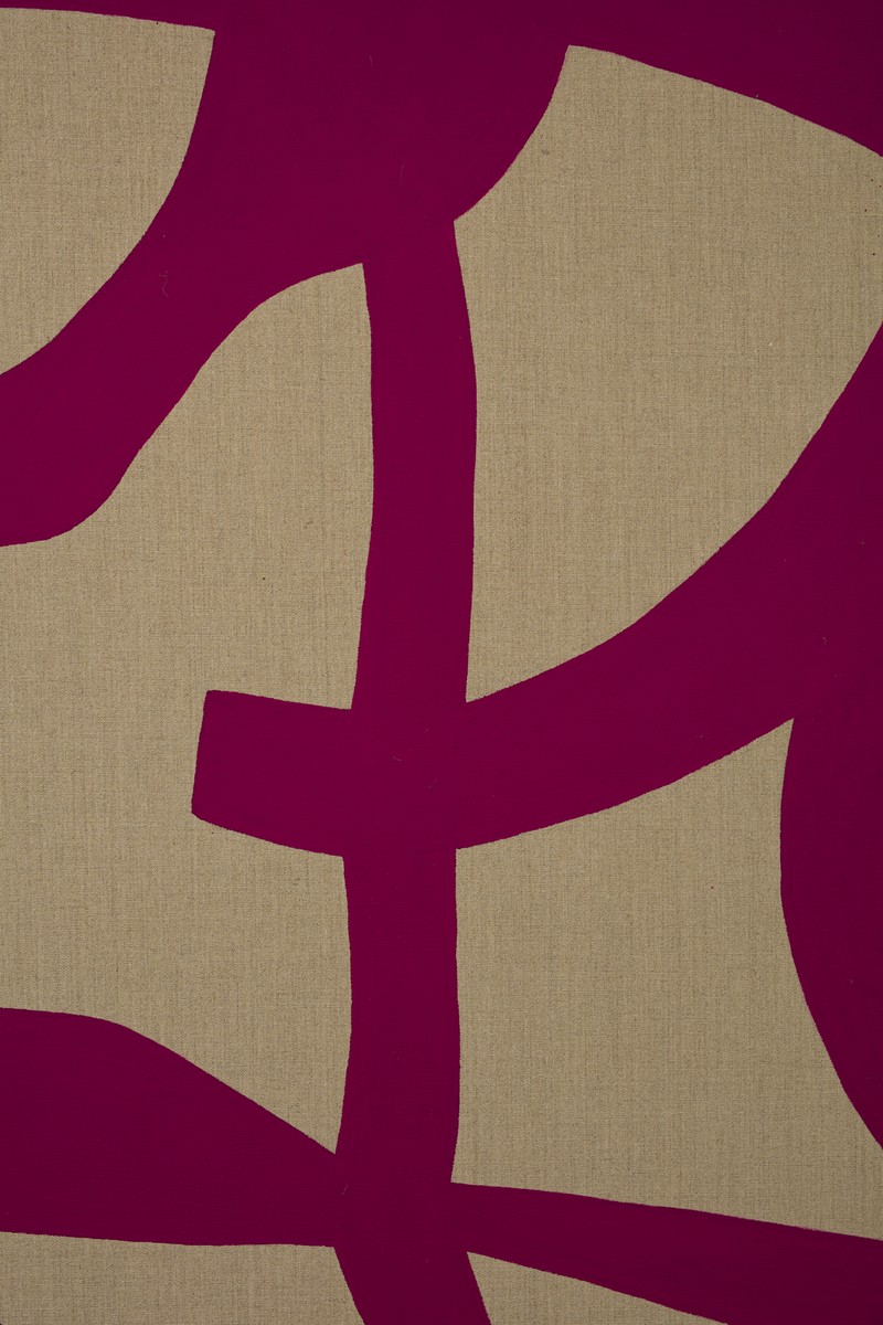 Nelle tele dei primi anni Duemila realizzate per l’esposizione alla Galleria Valentina Bonomo regna il contrasto binario tra tela grezza e colori vibranti, che si esprimono attraverso disegni monocromi dall’aspetto geometrico. In “Azione con cerchio” emerge il rigore del lavoro dell’artista, fedele al suo vocabolario, semplice ed essenziale, nell’esasperazione della sensazione del colore: i segni, ingranditi, si espandono armoniosamente su un’ampia superficie.
