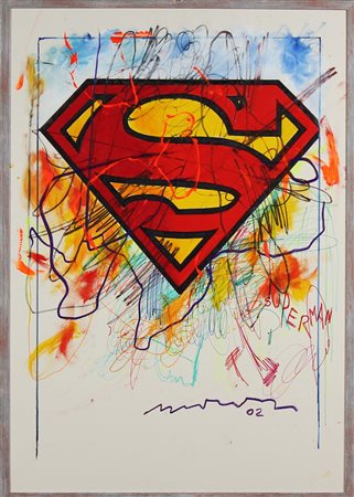 MANERA ENRICO (n. 1947) Superman. 2002. Tecnica mista su cartone. Cm 70,00 x 100,00. Firma in basso a destra. Autentica dell' artista su fotografia. Cornice presente