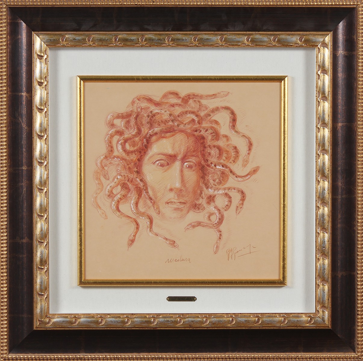 GONZAGA GIOVAN FRANCESCO (1921 - 2007) Medusa. Sanguigna e acquerello su carta. Cm 40,00 x 40,00. Firma e titolo in basso. Al retro firma per autentica e titolo. Cornice presente