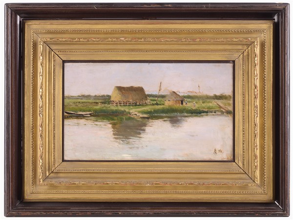 Giuseppe De Nittis "I capanni dei pescatori" olio su tavoletta (cm 13x23)firma