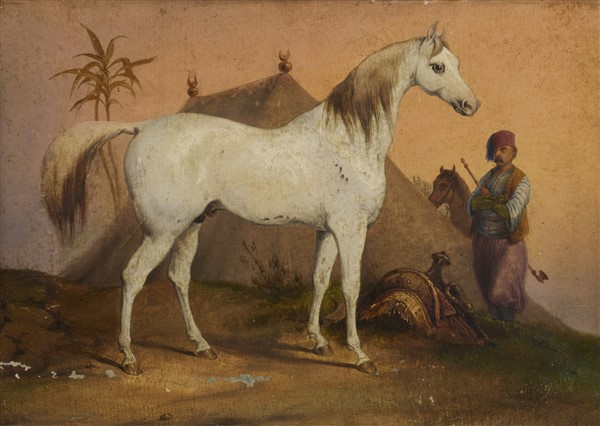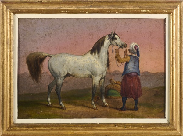 Scuola francese del secolo XIX, Coppia di dipinti raffiguranti "Soggetti orientalisti con cavalli"olio su cartone (cm 29x42)