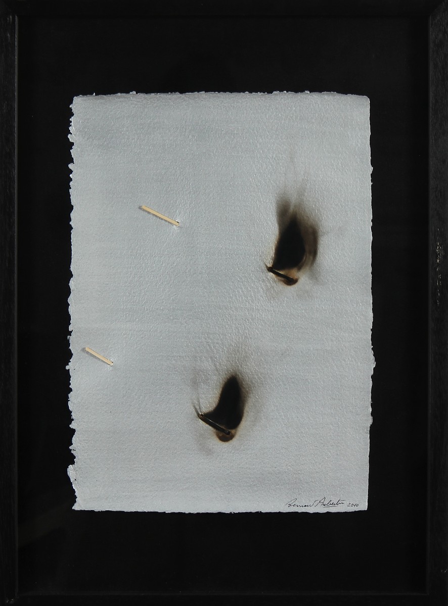 AUBERTIN BERNARD (n. 1934) Papier brulè, cartoncino argento. 2010. Cartoncino bruciato. Cm 50,00 x 36,00. Firma in basso a destra.Opera archiviata presso l' archivio Nordest, Seregno, come da documentazione fotografica allegata. Cornice presente