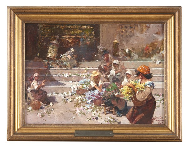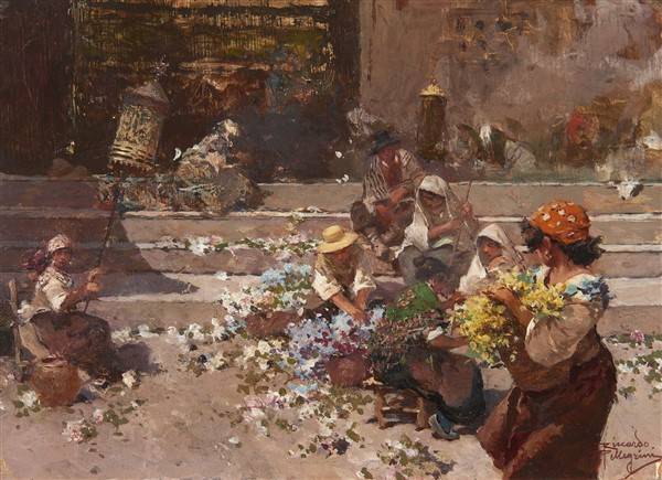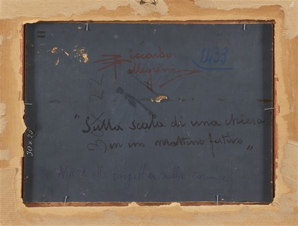 Riccardo Pellegrini "Sulla scala di una chiesa in un mattino festivo" olio su c