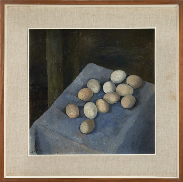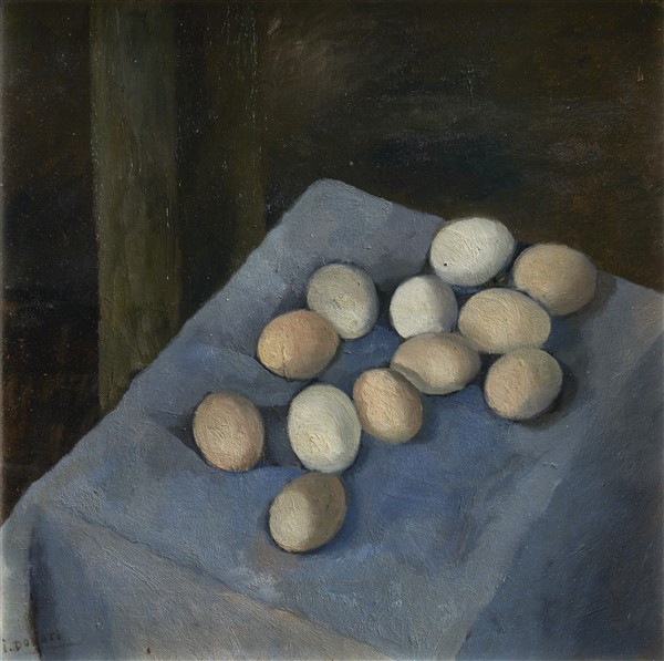 Ida Donati "Composizione con uova" olio su compensato (cm 47x49) firmato in bas