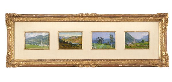 Quattro dipinti ad olio su cartoncino raffiguranti "Paesaggi" in un'unica cornice (cm 9x12)
