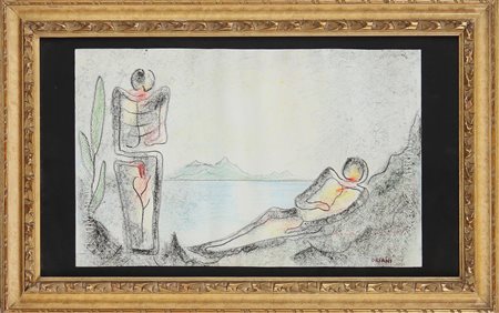ORIANI PIPPO (1909 - 1972) Senza titolo. Pastello su carta. Cm 48,00 x 29,50. Firma in basso a destra. Al retro timbro: Opera autentica del maestro Pippo Oriani. Cornice presente