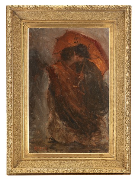 Attilio Andreoli "Il bacio sotto la pioggia" olio su tavola (cm 43x28) firmato