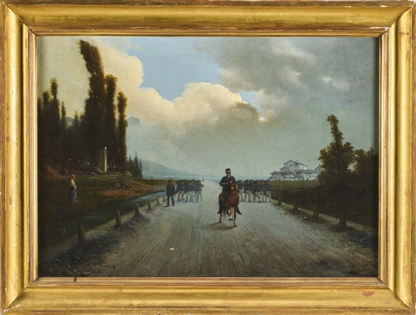 Costantino Rosa "Soldati su strada di campagna" olio su tela (cm 60x84) firmato