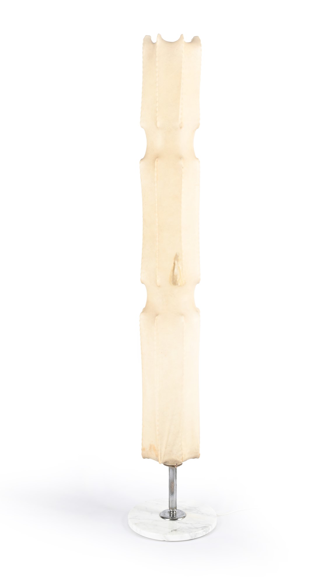 Lampada da terra in cocoon, struttura in metallo e base in marmo bianco Anni '60 cm 164x30 (diametro) Lampada da terra con base rotonda in marmo bianco. La struttura metallica interna è dotata di tre sorgenti luminose. Il paralume è in polimero plastico che in forma di microfilamenti viene applicato a spruzzo su una struttura di metallo; in questo modo si forma un “bozzolo” di seta (da cui deriva il nome).