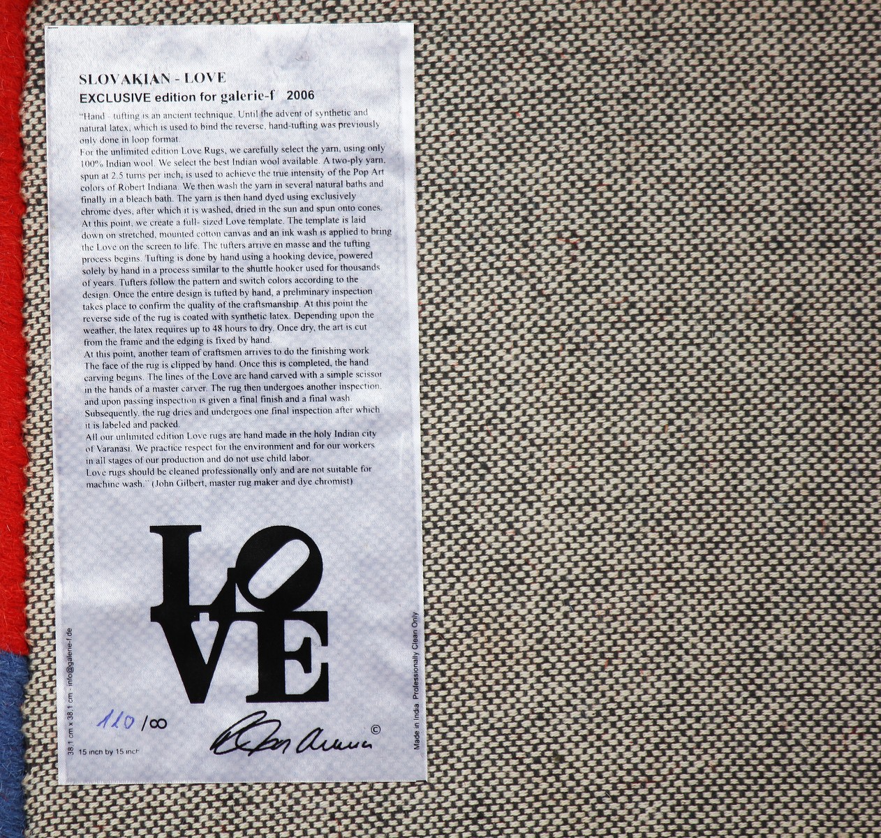 INDIANA ROBERT (n. 1928) Love rug. 2006. Tappeto. Cm 38,10 x 38,10. Edizione esclusiva per la galleria Galerie-f, come da cartiglio incollato al retro.