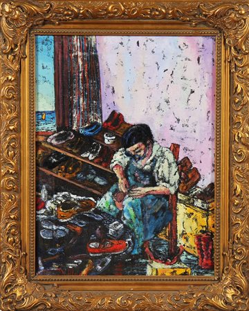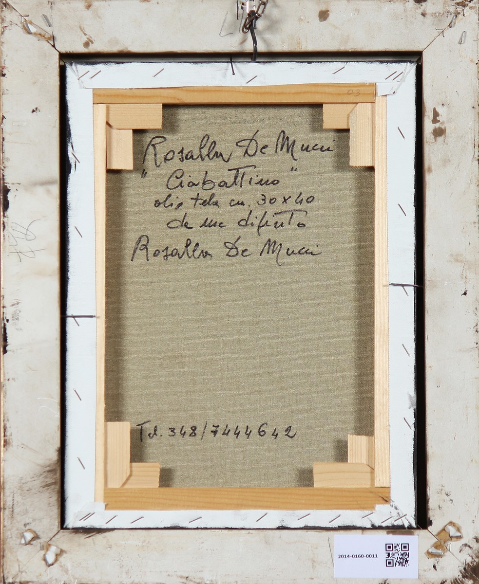 DE MUCCI ROSALBA (n. 1942) Ciabattino. Olio su tela . Cm 30,00 x 40,00. Firma in basso a sinistra. Al retro autentica dell' artista. Cornice presente