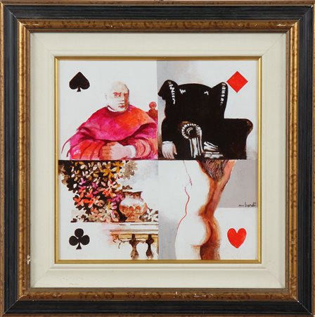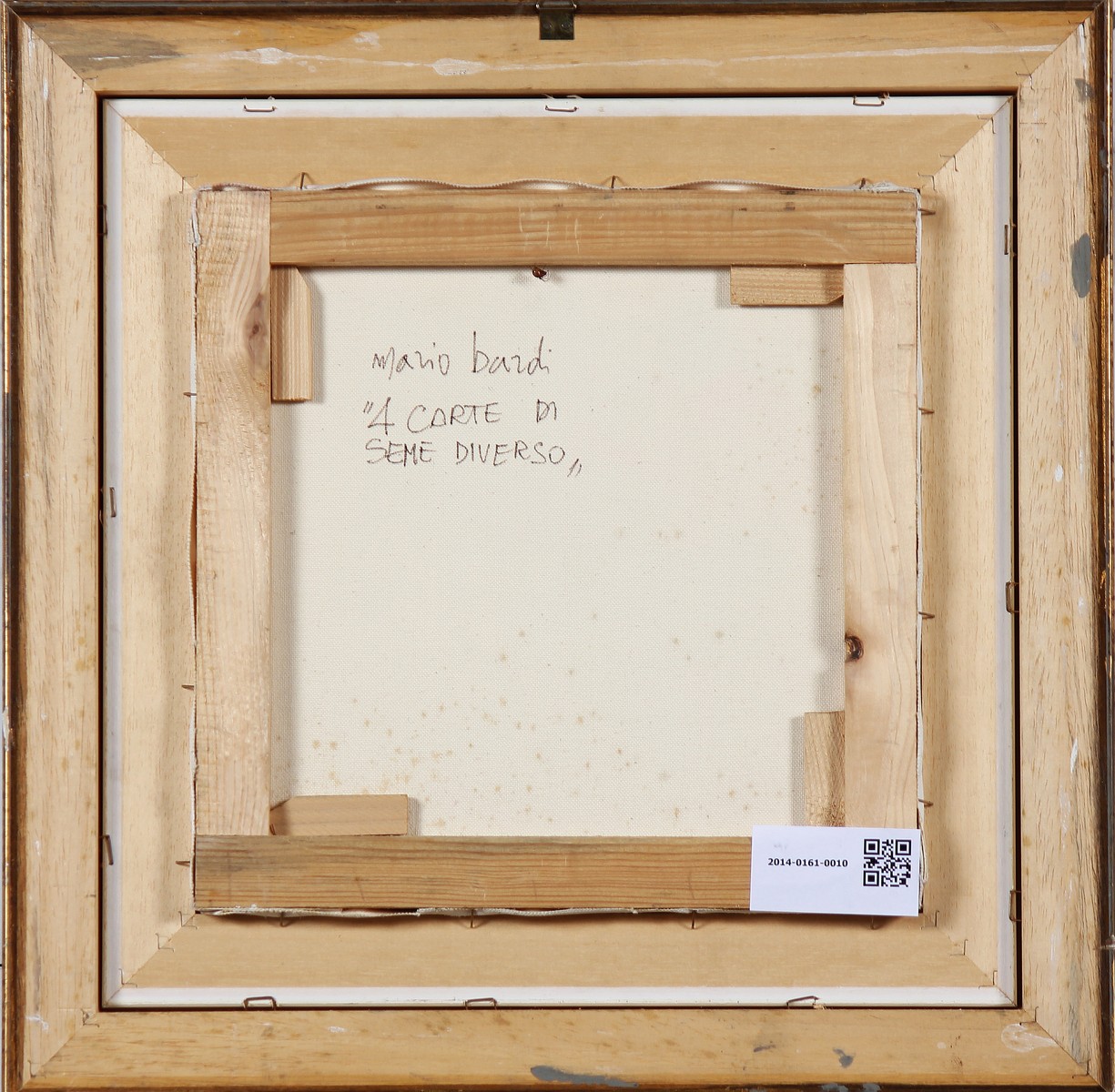 BARDI MARIO (1922 - 1998) 4 carte di seme diverso. Olio su tela . Cm 30,00 x 30,00. Firma n basso a destra. Firma e titolo al retro. Cornice presente