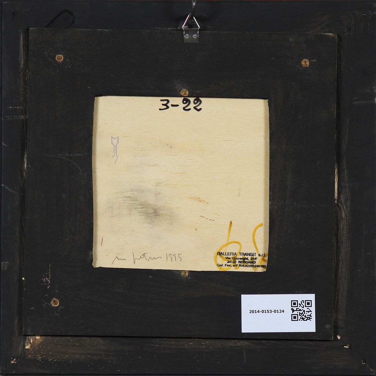 PETRUS MARCO (n. 1960) Senza titolo. 1995. Olio su tela su tavola. Cm 19,00 x 19,00. Al retro firma,anno e timbro della Galleria Transit, Bergamo, firmato da Donato Locatelli. Cornice presente