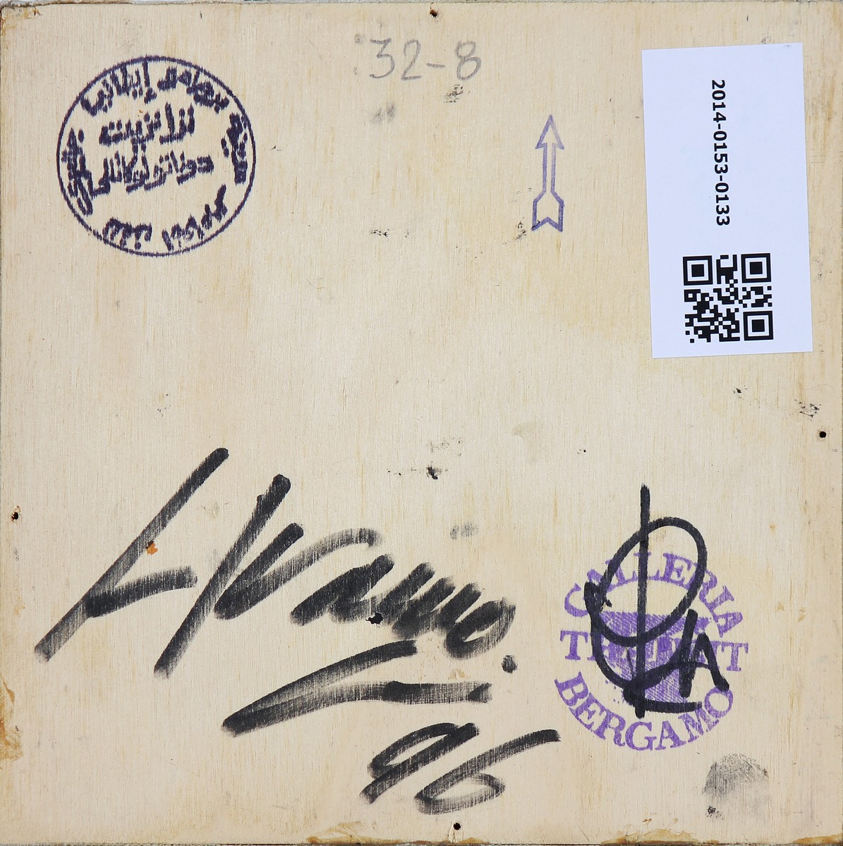 CEI SILVANO (n. 1954) Senza titolo. 1996. Tecnica mista su tela su tavola. Cm 19,00 x 19,00. Al retro firma anno e doppio timbro della Galleria Transit, Bergamo in italiano e arabo.