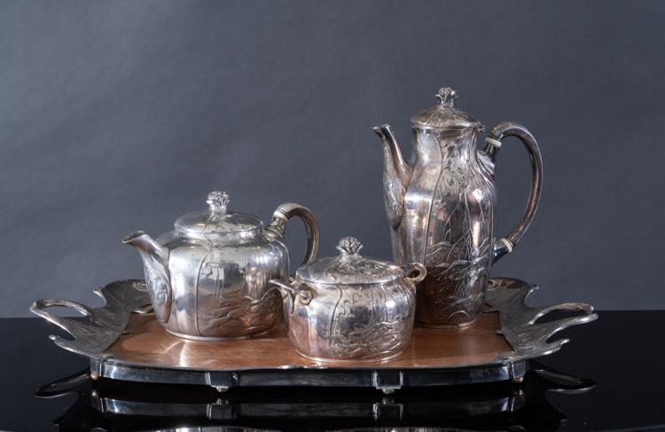 Servizio da tè e caffè in metallo argentato e vassoio, Orfèvrerie Gallia, Francia