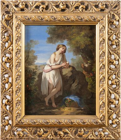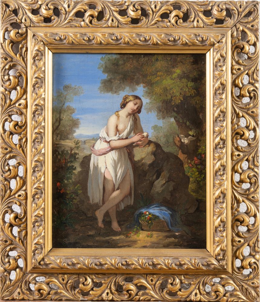 Maestro francese tra XVIII e XIX secolo. Fanciulla nel bosco. Cm. 37x35. Olio su tela. Al retro iscrizione non decifrata sul supporto della tela.