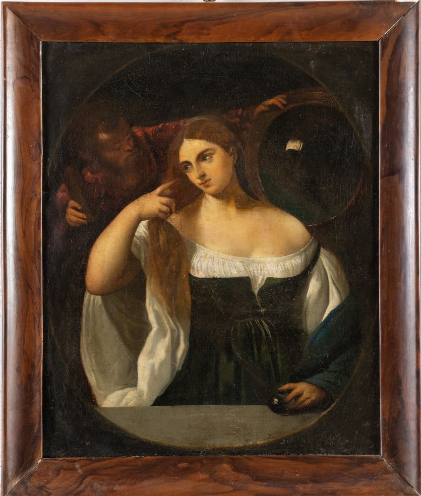 Maestro del XVII secolo. Giovane donna allo specchio (copia da Tiziano). Cm. 34x26,8. Olio su tela.