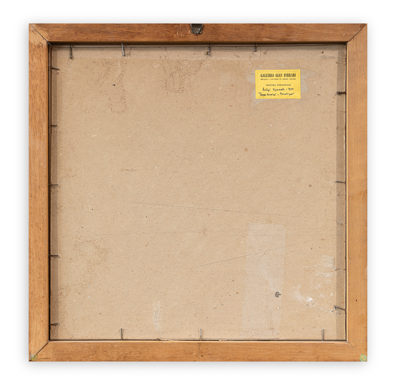 Etichetta della Galleria Gian Ferrari (MI) con caratteristiche tecniche dell'opera al retro del cartone protettivo