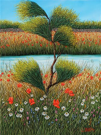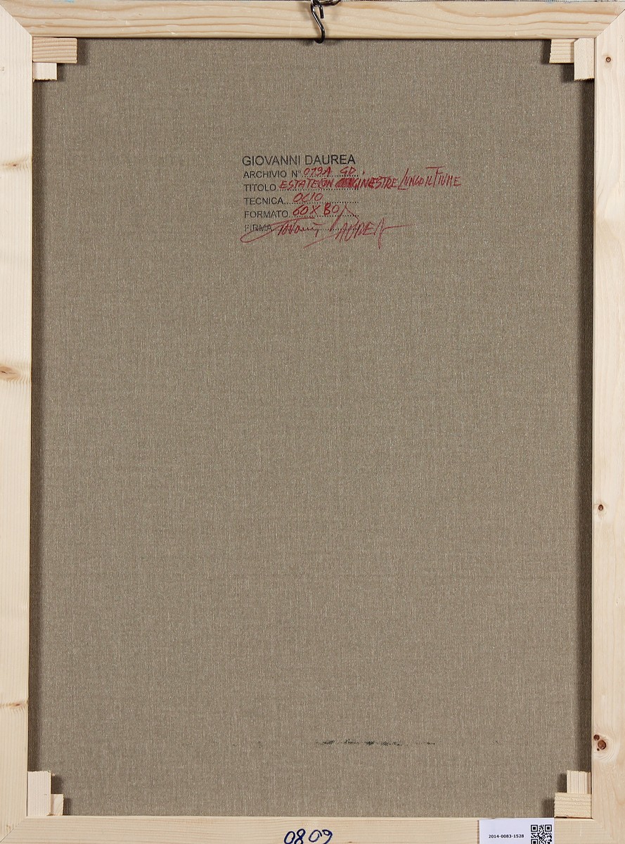 DAUREA GIOVANNI (n. 1955) Estate con ginestre lungo il fiume. Olio su tela . Cm 60,00 x 80,00. Firma in basso a destra. Al retro cartiglio descrittivo per autentica, numero di archivio e firma. Autentica dell'artista su fotografia come documentazione fotografica allegata all'opera.