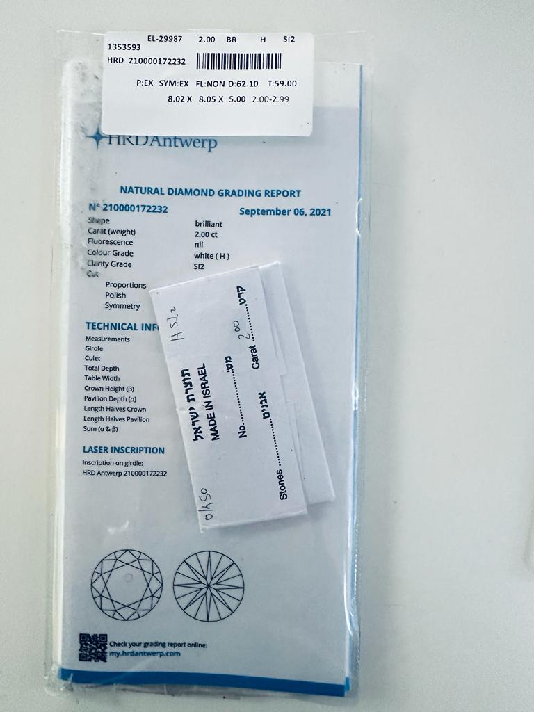 DIAMANTE NATURAL POLISHED 2 CARATI COLORE H - PUREZZA SI2 - TAGLIO BRILLANTE - CERTIFICATO HRD - KK31201