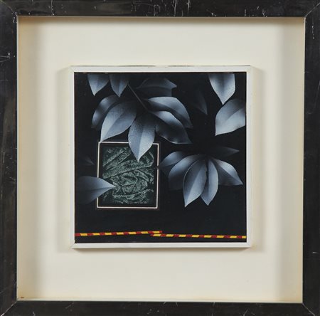 BENEDETTI MARIO (n. 1938) Situazione limite nel paesaggio. 1973. Olio su tela . Cm 18,00 x 18,00. Al retro firma titolo anno e timbro della galleria Spriano, Omegna. Cornice presente