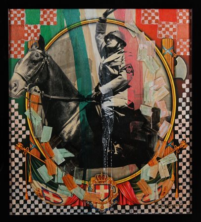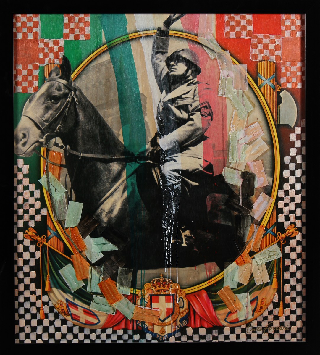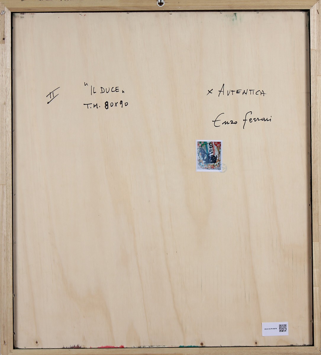 FERRARI ENZO Il duce. Tecnica mista su tavola. Cm 90,00 x 80,00. Al retro titolo e firma per autentica. Timbro dell'Associazione Nazionale Il Quadrato. Autentica dell'artista su fotografia come da documentazione allegata all'opera. Cornice presente