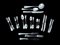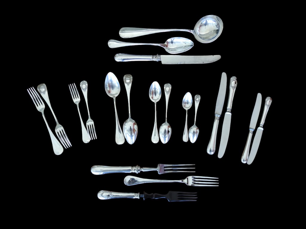 composto da 12 cucchiaini, 12 forchette da dolce, 12 cucchiai da dolce, 12 coltelli da dolce, 12 forchette, 12 coltelli e 12 cucchiai. Più 1 mestolo, 2 posate da portata, 2 posate da insalata (argento e osso).