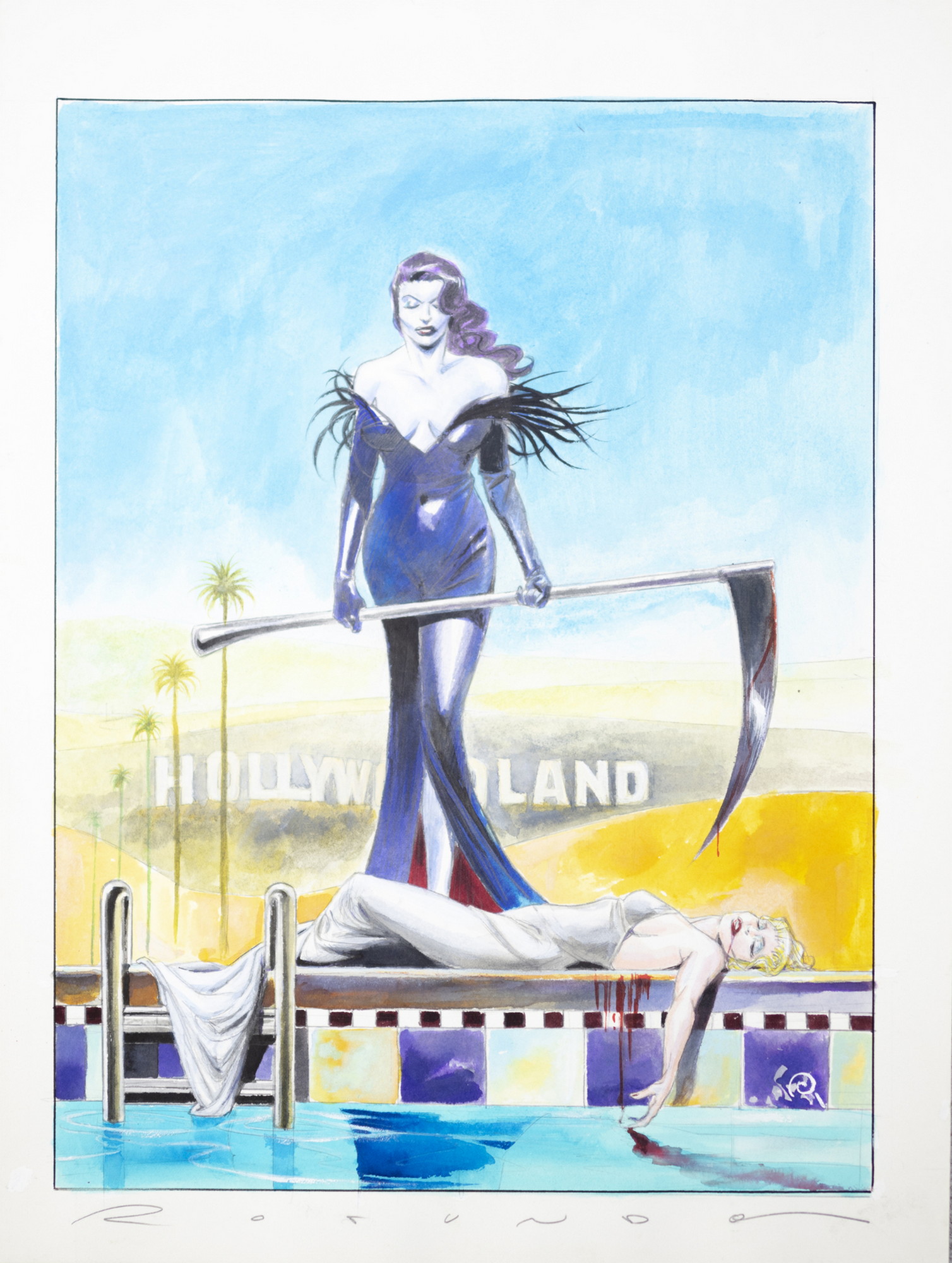 ROTUNDO MASSIMO "HOLLYWOOD DI SANGUE". 1999. Olio su carta. Cm 40,00 x 30,00. Figlio di una tradizione da Orient Express, da Lanciostory già da verso la fine degli anni 70, e poi su l’Eternauta e Comic Art, verso la metà degli anni ‘80, con lui si scoperchia la vera grande pentola del fumetto d’avventura e di ricostruzione storica. Poi Metal Hurlant, Torpedo, Sette. Lui che è l’ultimo vero protagonista degli sketches artist e character designers, uno capace di disegnare in qualunque circostanza, dagli happenings con la Scuola romana dei fumetti, fino ai set di Paul Verhoeven e appunto Martin Scorsese.