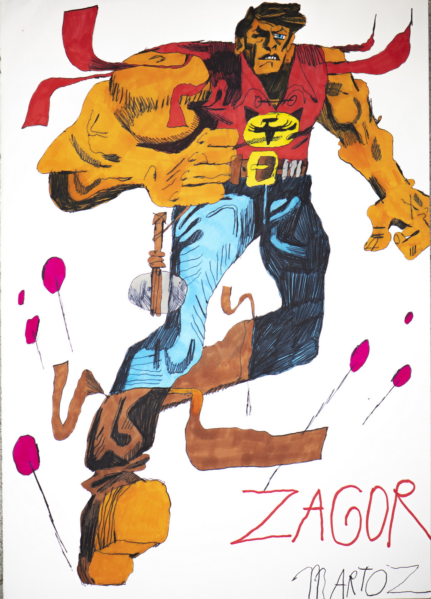 MARTOZ "Lo spirito con la scure". penna e pennarelli su cartoncino. Cm 30,00 x 42,00. Rilettura del personaggio di Zagor per questo giovanissimo illustratore tra i nuovi talenti della scena italiana. I suoi disegni quasi fatti nottetempo, come dice lui, in ubriachezza. Così nel catalogo di Sconfinamenti.