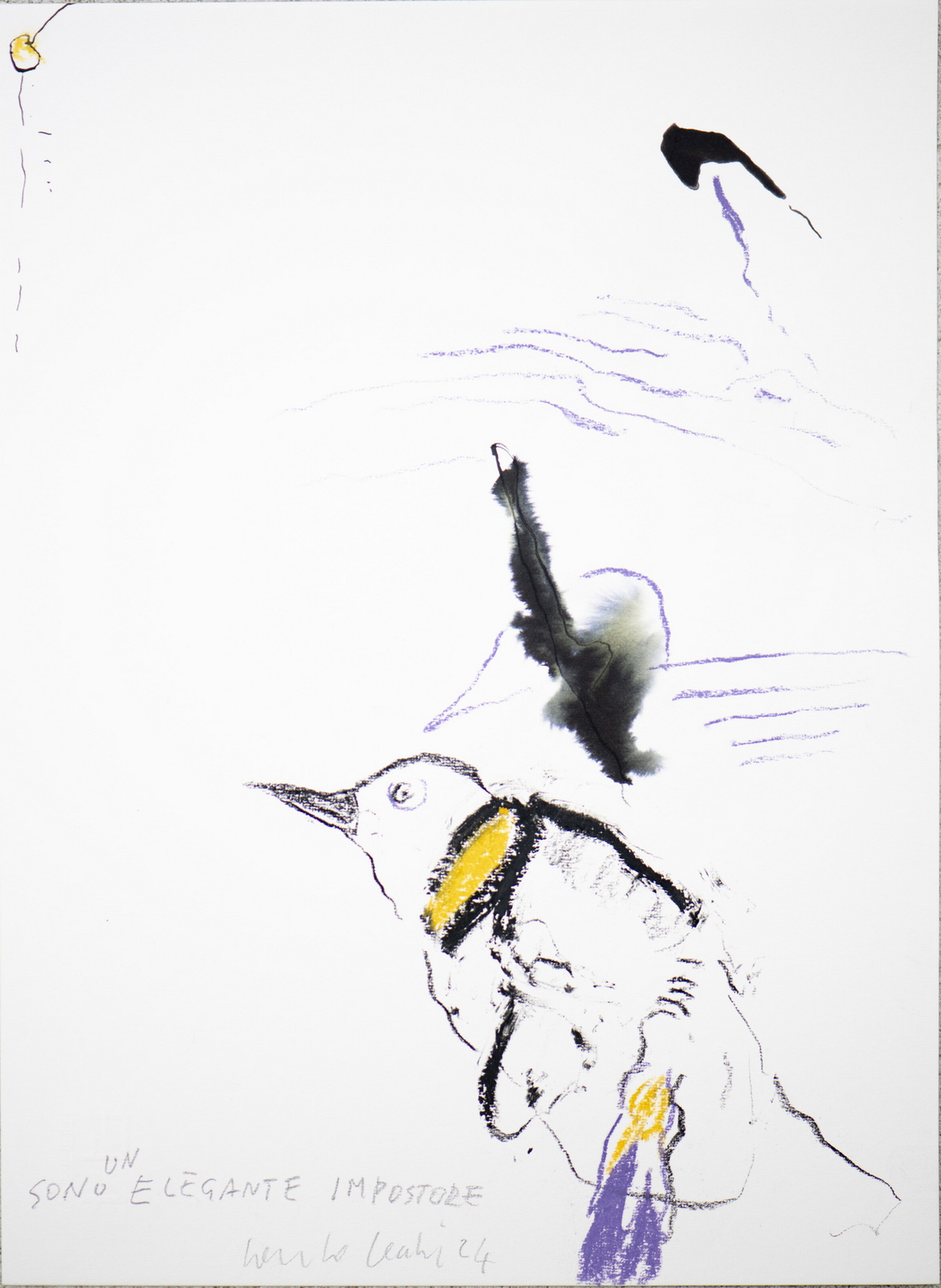 cecchi carlo Senza titolo. 2024. Tecnica mista su carta. Cm 33,00 x 24,00. Opera inedita: studio di pinguini realizzata per il Dipartimento Comics e per questa specifica asta.Rimbalza da tempo immemorabile il pinguino di Carlo Cecchi nei suoi disegni, quasi ormai gabbiano alla Hugo Pratt, ma mai prima d’ora aveva espresso simili pensieri e concetti come in queste tavole a tecnica mista.