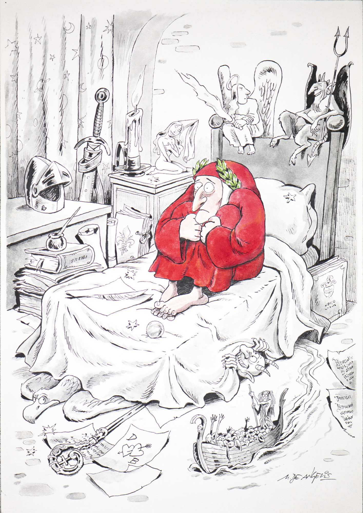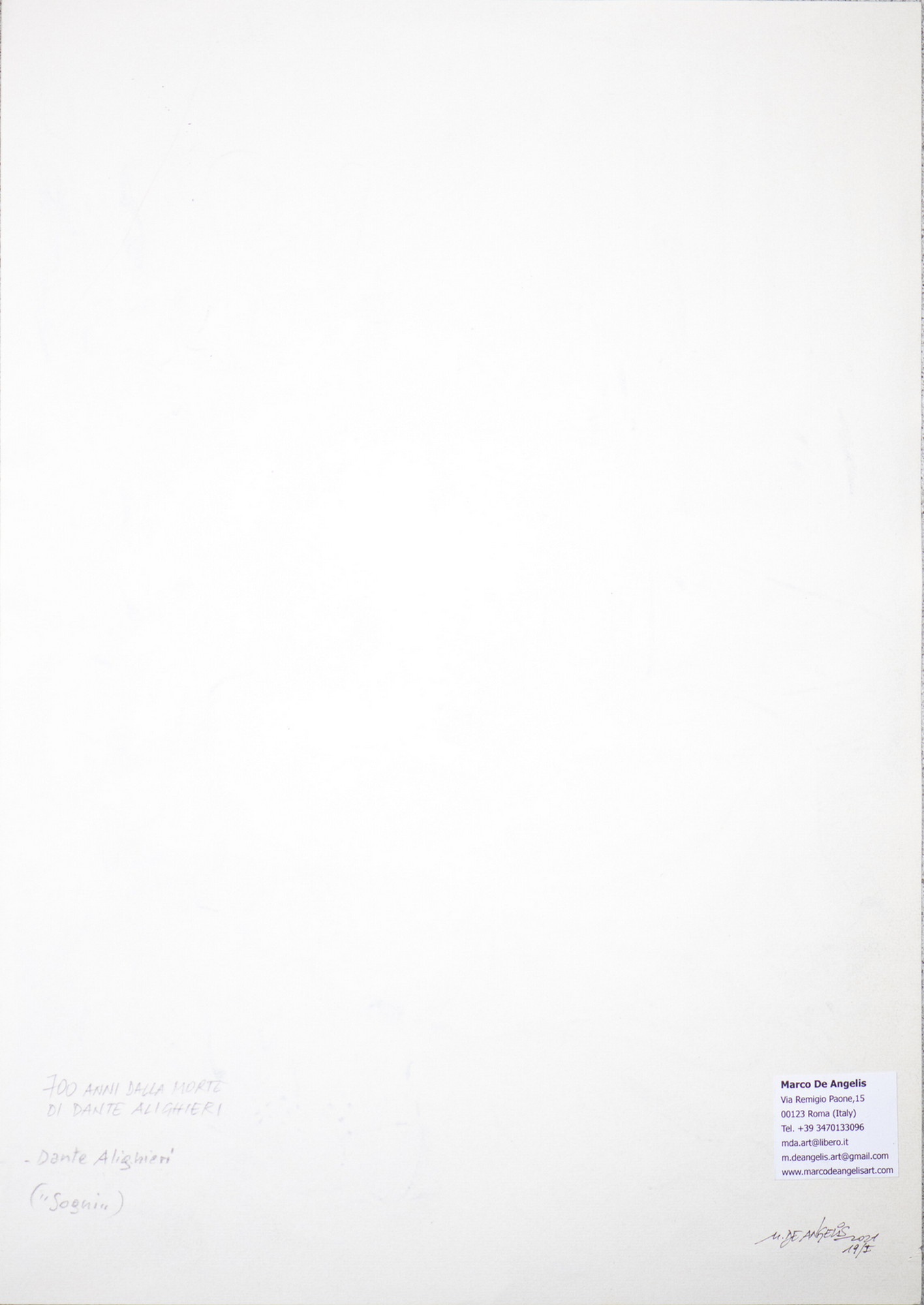 De Angelis Marco "Dante Alighieri 700". Tecnica mista (china, acquerelli, matite acquerellabili) su cartoncino. Cm 29,70 x 42,00. Realizzato per la mostra collettiva “Dante 7 volte 100” (a cura di Stefano Giraldi), a 700 anni dalla morte ed esposto in altre collettive, Lucca, ecc.