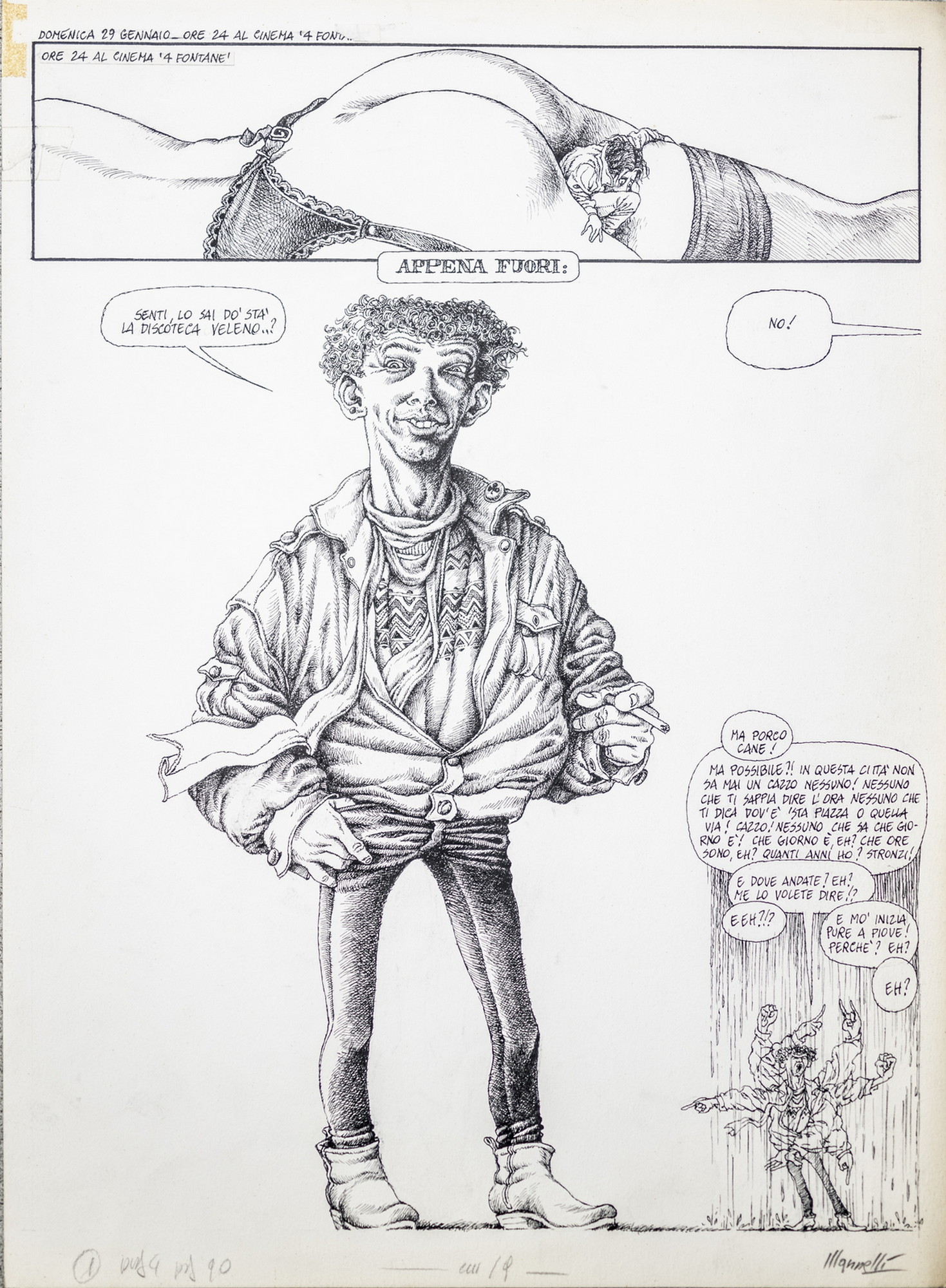 MANNELLI RICCARDO Critiche cinematografiche disegnate: La Chiave, di Tinto Brass. 1984. China su carta. Cm 33,00 x 48,00. Rarissima tavola del periodo quando l'artista realizzava critiche cinematografiche disegnate. Opera pubblicata su Playmen