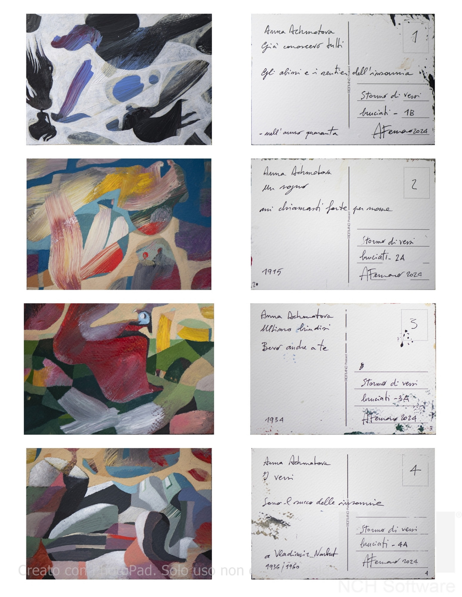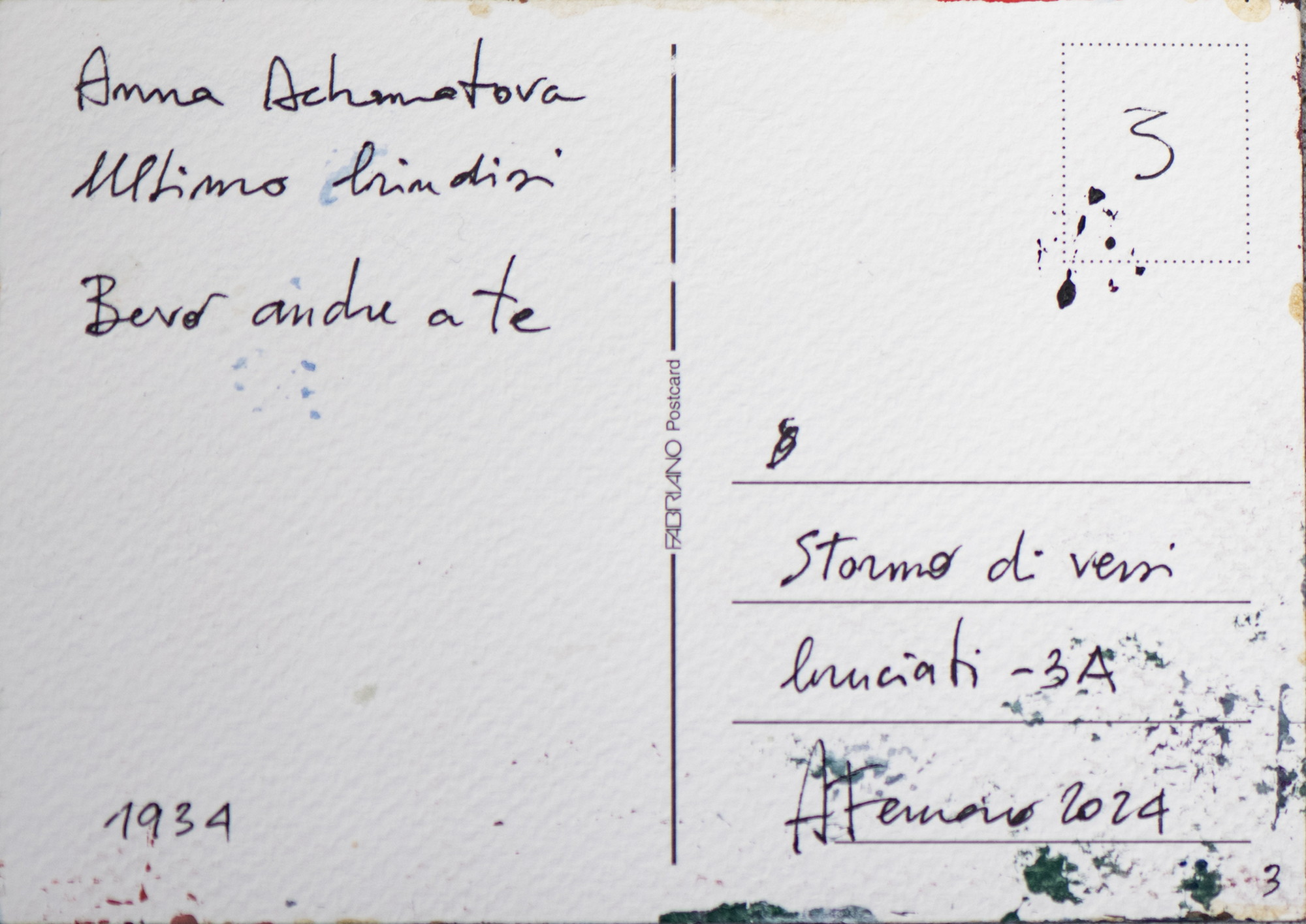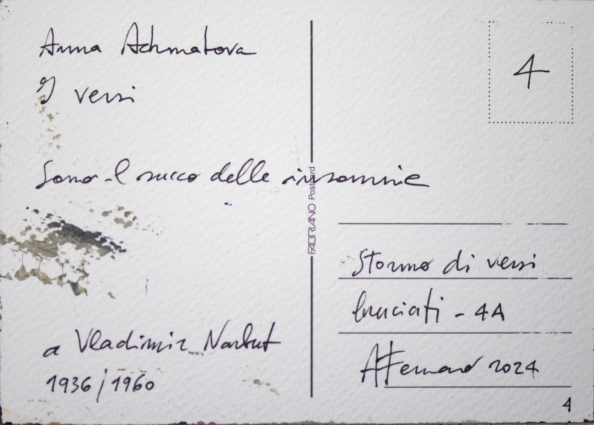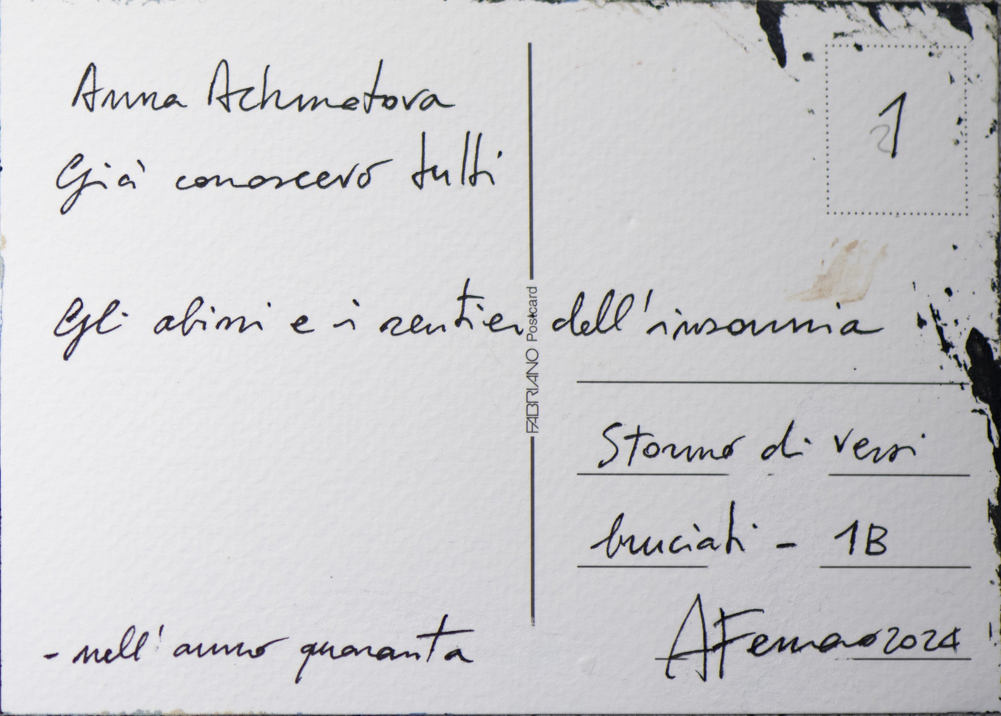 FERRARO ALESSANDRO "Anna Achmatova, stormo di versi bruciati". acrilico su carta. Cm 15,00 x 11,00. "La serie delle cartoline in poesia, una delle ultime ricerche dell'artista con questa sua idea della parola come segno magico e dell’importanza del valore simbolico delle lettere dell’alfabeto che ne ha fatto anche uno stile pittorico e illustrativo". Così dal catalogo di Sconfinamenti.