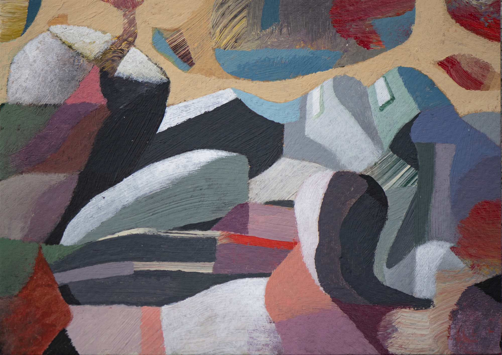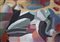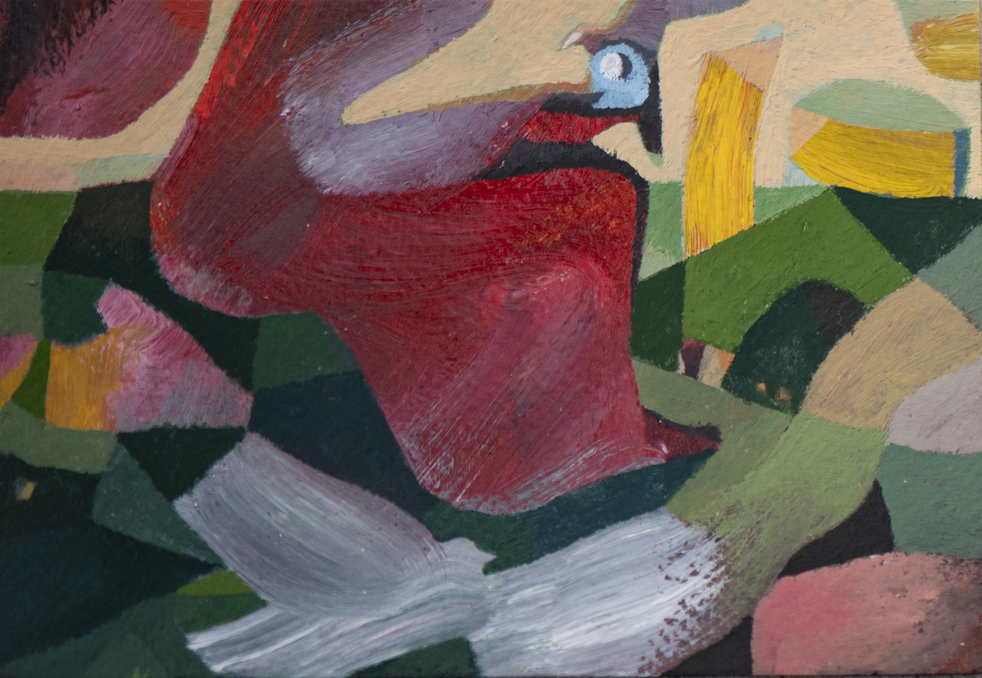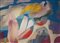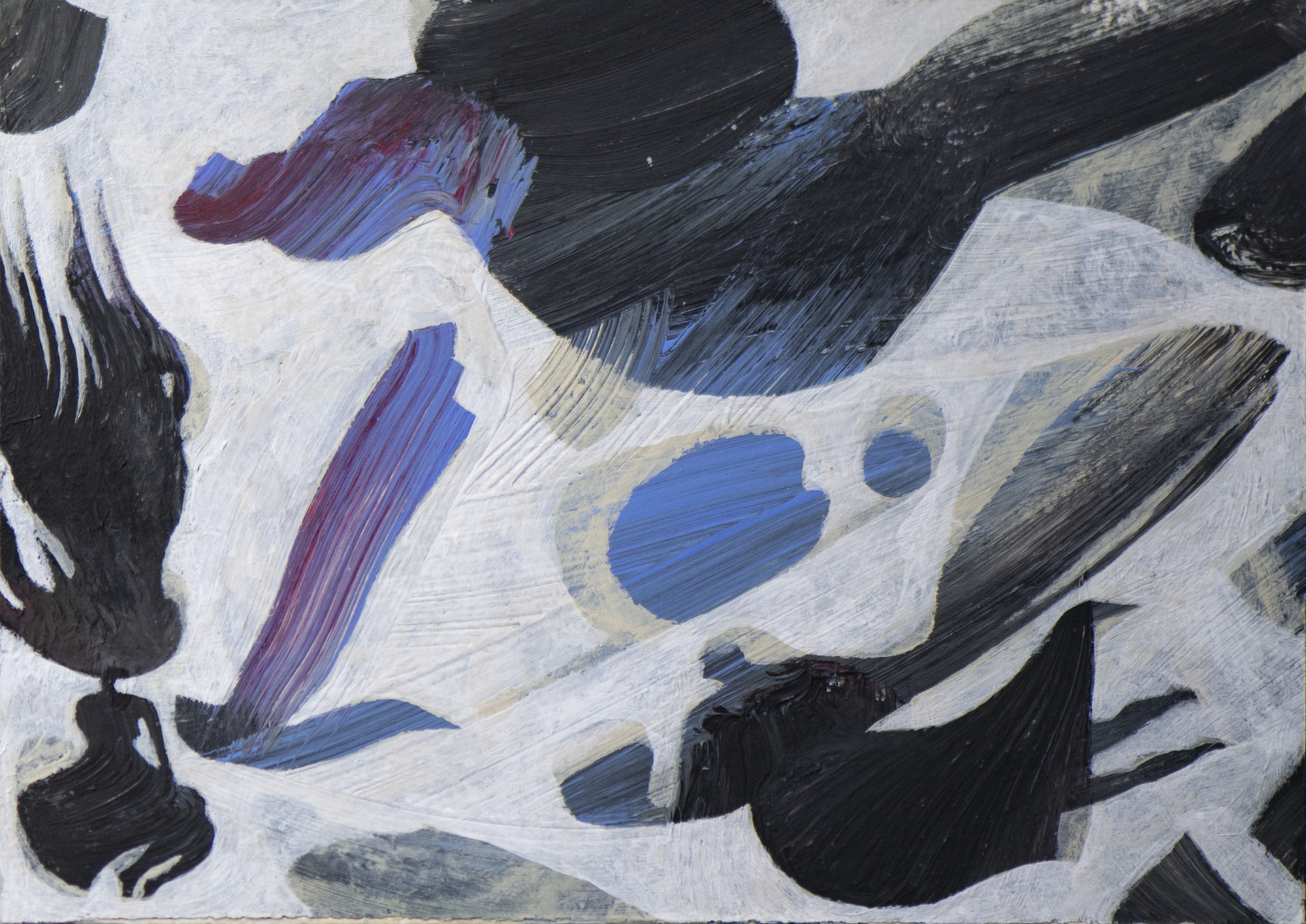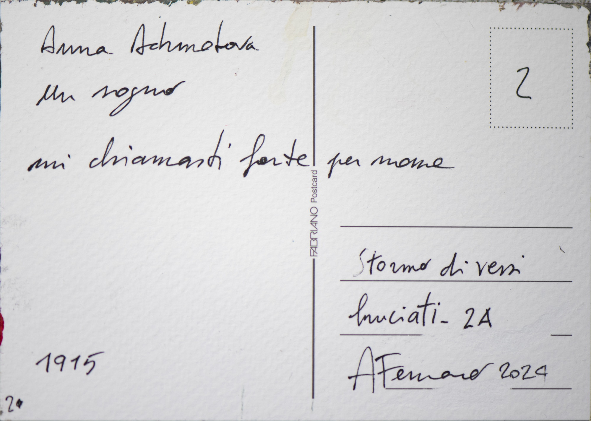 FERRARO ALESSANDRO "Anna Achmatova, stormo di versi bruciati". acrilico su carta. Cm 15,00 x 11,00. "La serie delle cartoline in poesia, una delle ultime ricerche dell'artista con questa sua idea della parola come segno magico e dell’importanza del valore simbolico delle lettere dell’alfabeto che ne ha fatto anche uno stile pittorico e illustrativo". Così dal catalogo di Sconfinamenti.