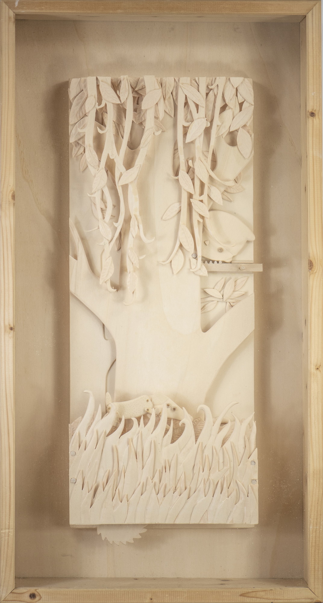 TERRANERA LORENZO "COSIMO MONGOLFIERA". 2015. MULTISTRATO DI PIOPPO E VETRO. Cm 42,00 x 77,00 x 13,00. Una teoria di bassorilievi in compensato di pioppo racchiusi in teca di abete e vetro, come le edicole napoletane, libertà poetica a parte. Ovvero il racconto del giovane Barone Cosimo Piovasco di Rondò, in arte Il Barone rampante di Italo Calvino. Episodi della sua vita, della sua saga, trasformati in teatrino animato, in bassorilievo semovente con inserti anche di stecchini e colla e corde.